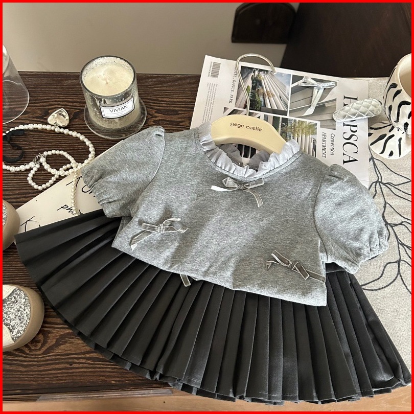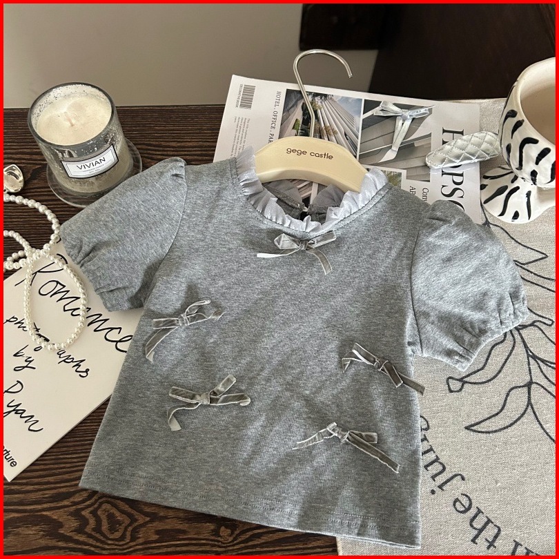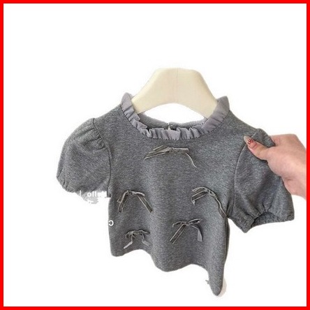 1- 8 Tahun Blouse Anak Perempuan Abu Abu Pita Mini Atasan Cute Elegan Kaos Anak Lengan Puff Premium Baju Anak Perempuan