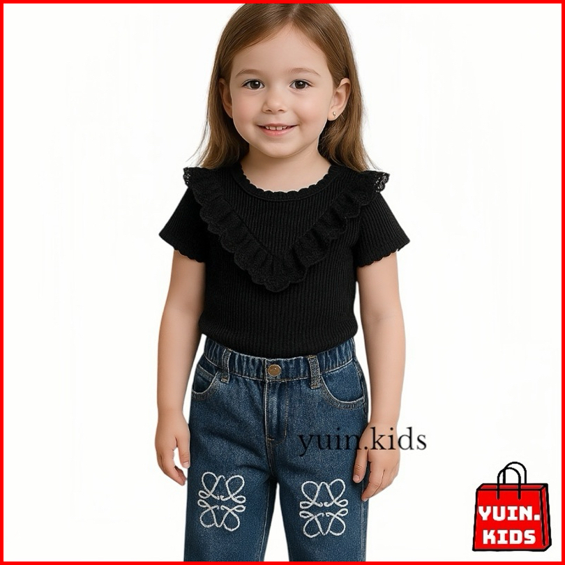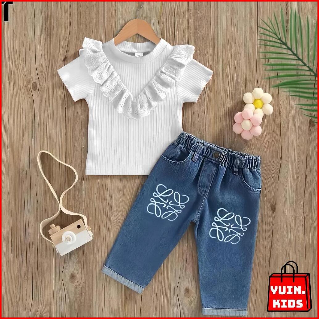 Setelan Anak Perempuan Kekinian Motif Lowe Usia 1-5 Tahun Set Baju Renda Dan Celana Jeans Anak