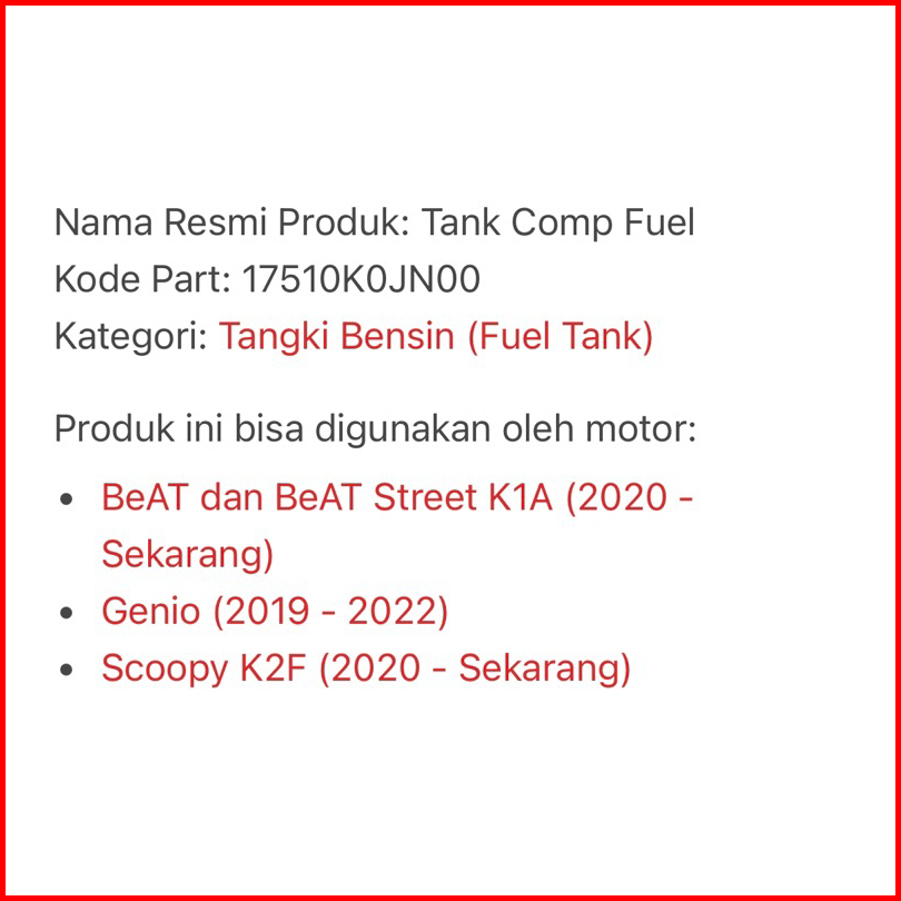 Tangki Bensn Fuel Tank Beat Deluxe Genio Scoopy New 17510-k0j-n00 Honda Ahm