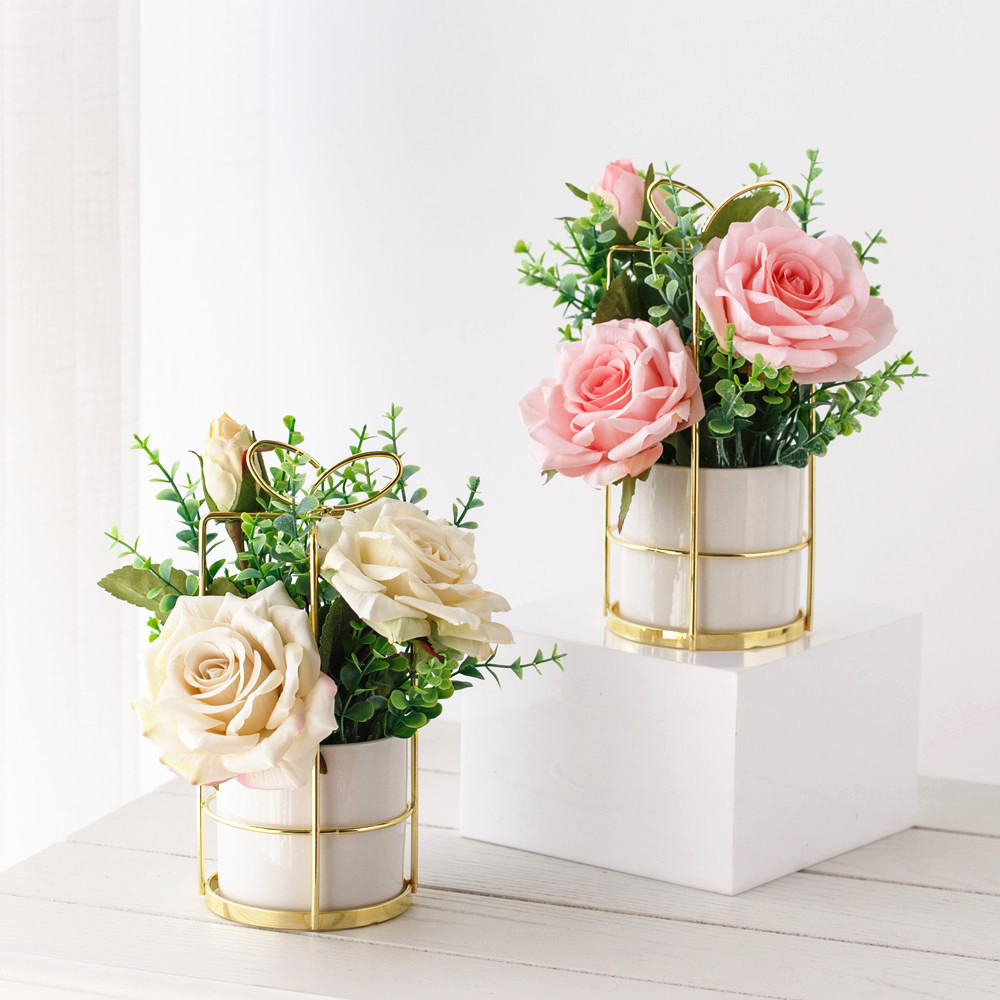 Set bunga buatan Nordik vas emas keramik mawar pot tanaman buatan dekorasi rumah pot bunga palsu