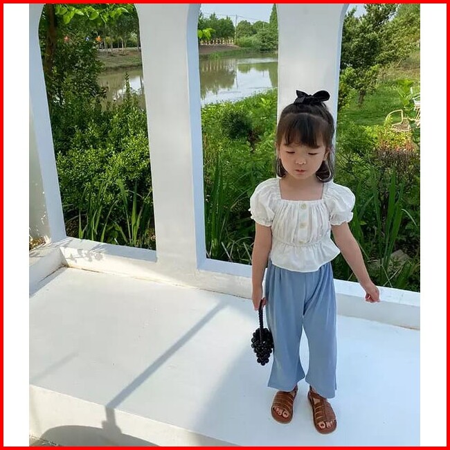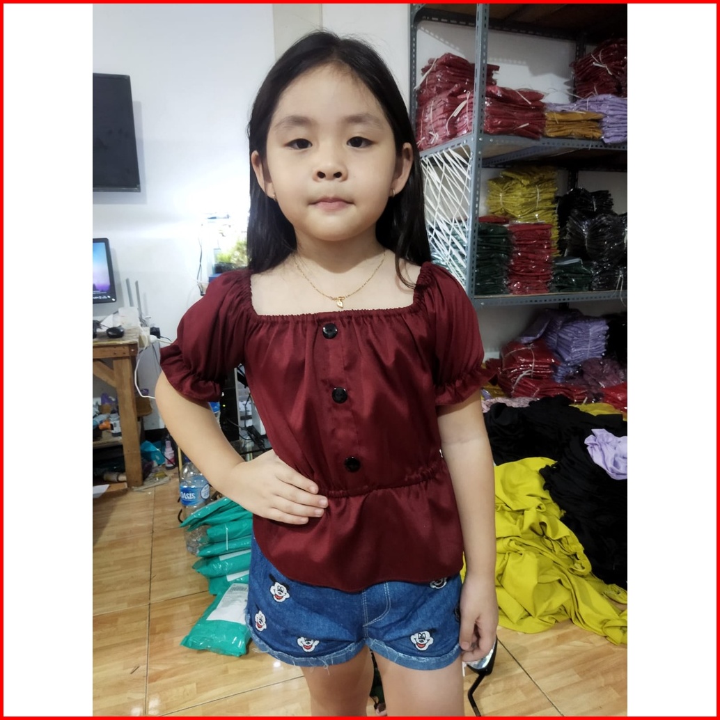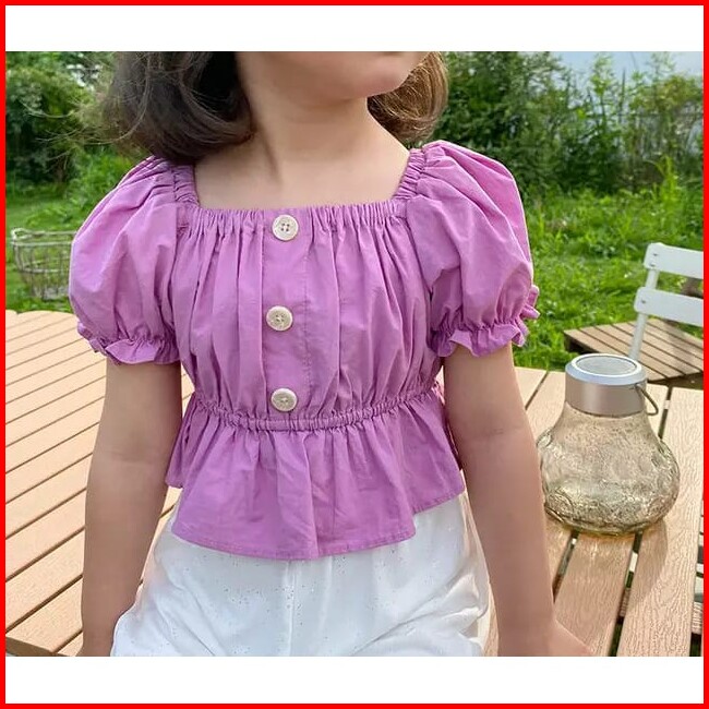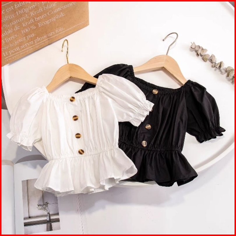 Baju Atasan Anak Perempuan Sabrina Kerut Anak Cewek Tangan Balon Lengan Pendek Kombinasi Kancing Sabrina Premium Anak Pe