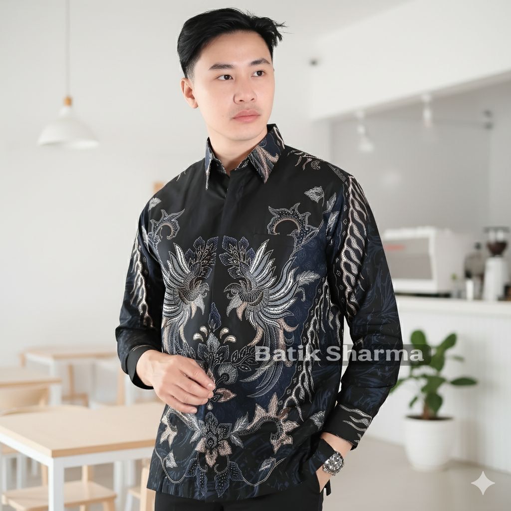Kemeja Batik Pria Lengan Panjang Surya Hitam Baju Batik Cowok Formal Casual Slimfit Terbaru Terlaris