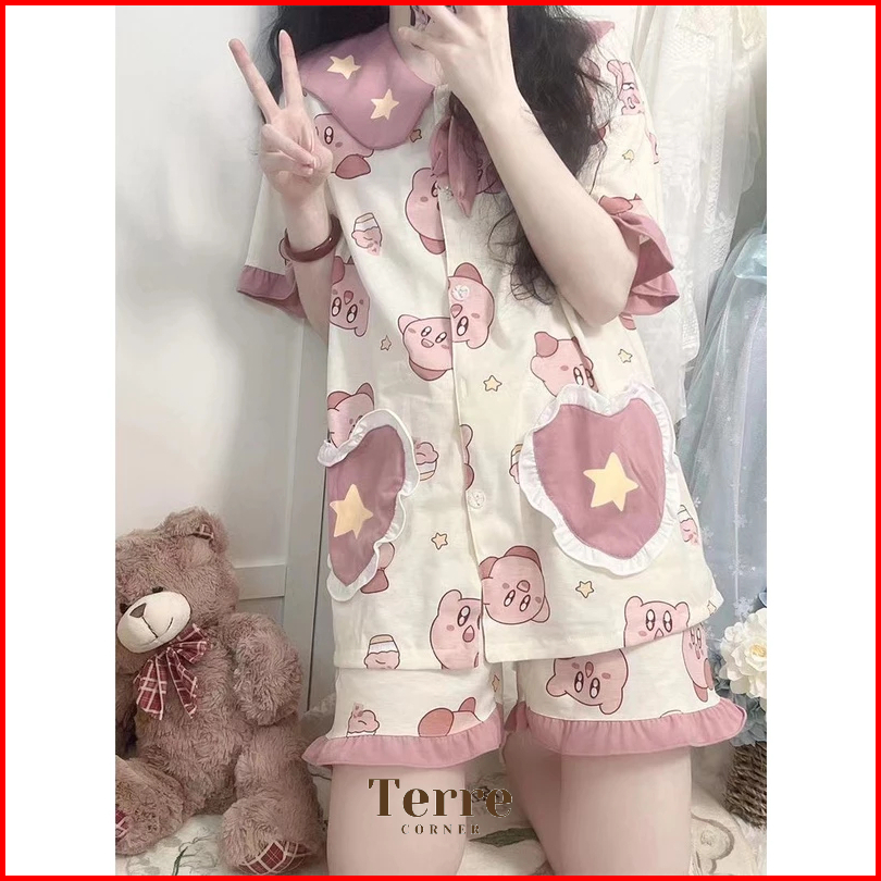 Baju Tidur Piyama Wanita Kirby Sleepwear Korea Setelan Motif Pita Lengan Pendek Celana Pendek Import