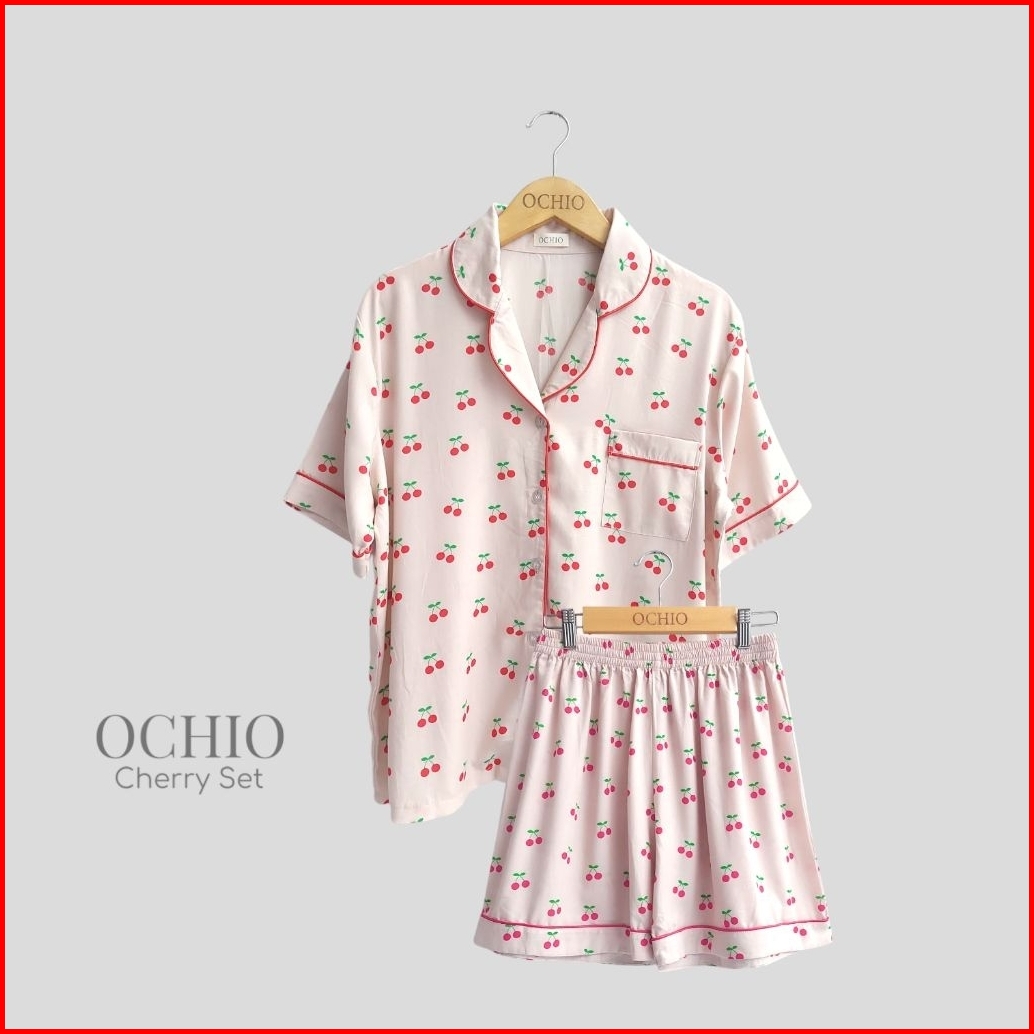 Ochio - Cherry Set Pajamas Piyama Baju Tidur Sleepwear One Set Wanita Rayon Cherry Series Motif Ceri