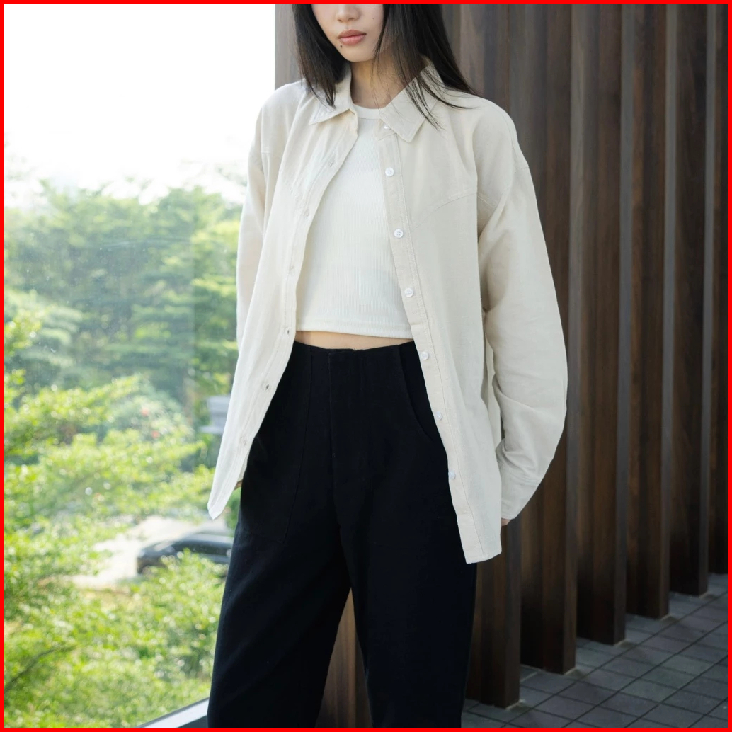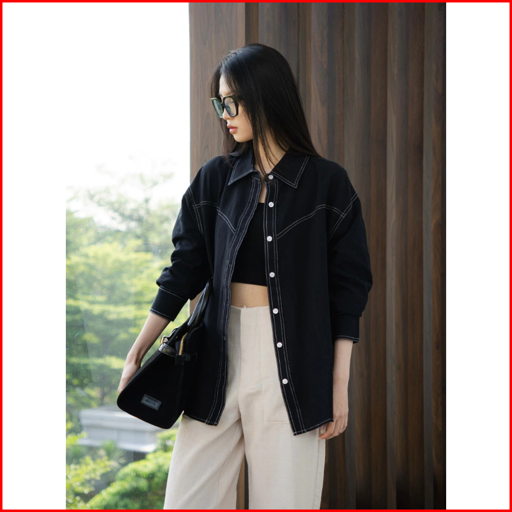 Vine Shirt Atasan Wanita Kemeja Oversize Long Sleeve Kemeja Basic Shirt Contrast Stitch Linen