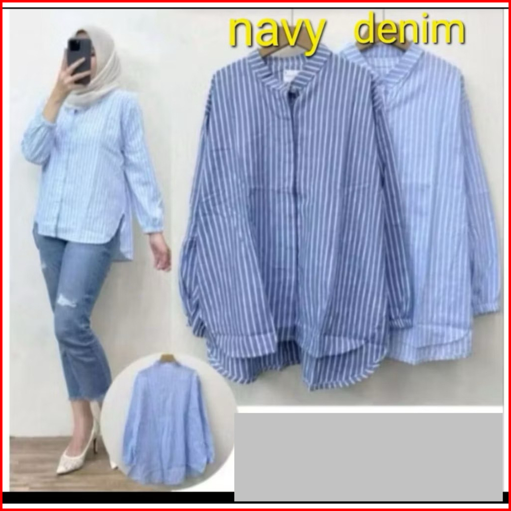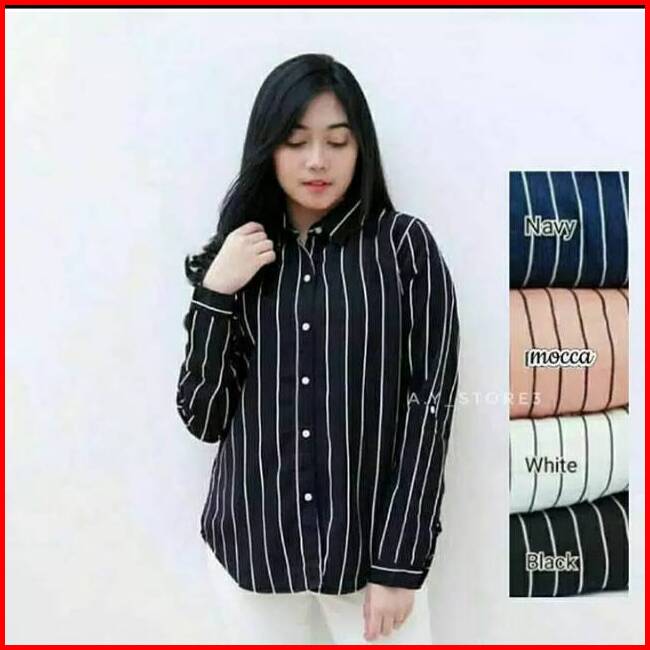 Kameja Krah Salur.kemeja Blouse Salur Striped Wanita Lengan Panjang
