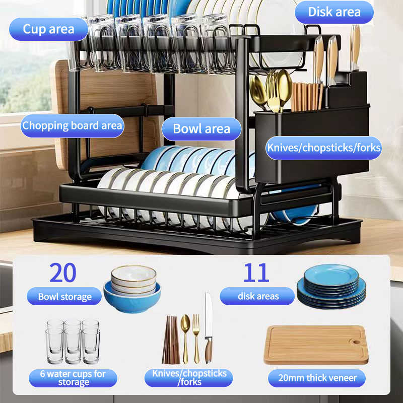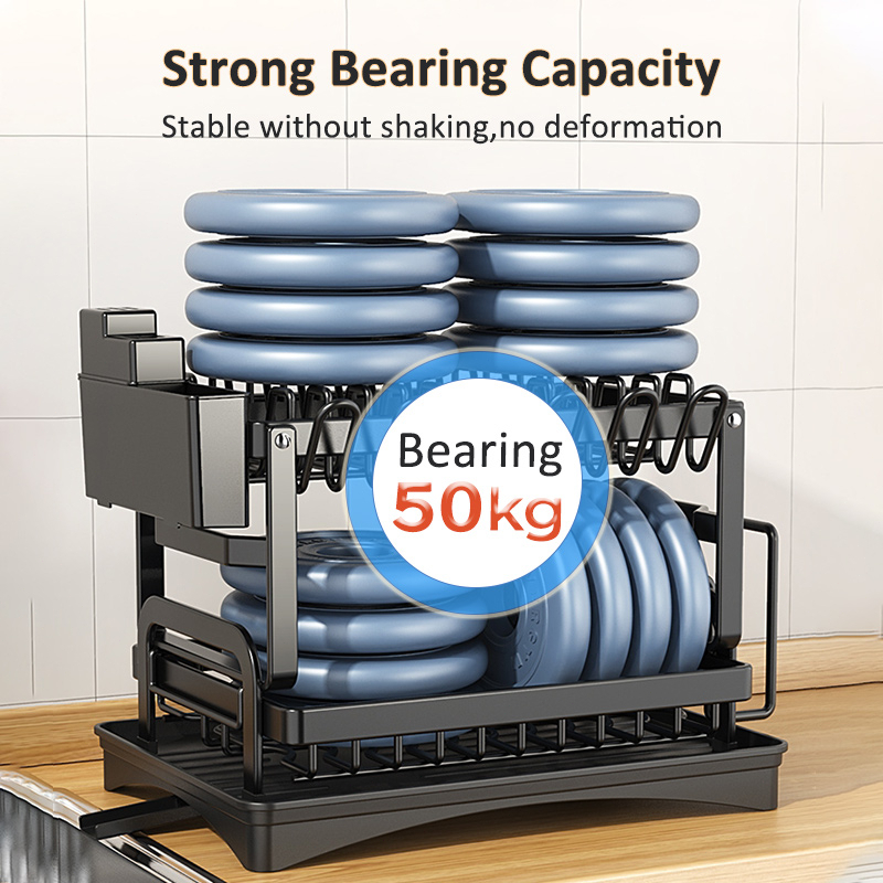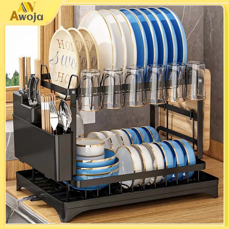 Rak Piring Dapur Stainless Steel 2 Tingkat Pengering Piring Rak Cangkir Rak Mangkuk Piring Dengan Baki Wastafel Dapur Dengan Pembuangan Air