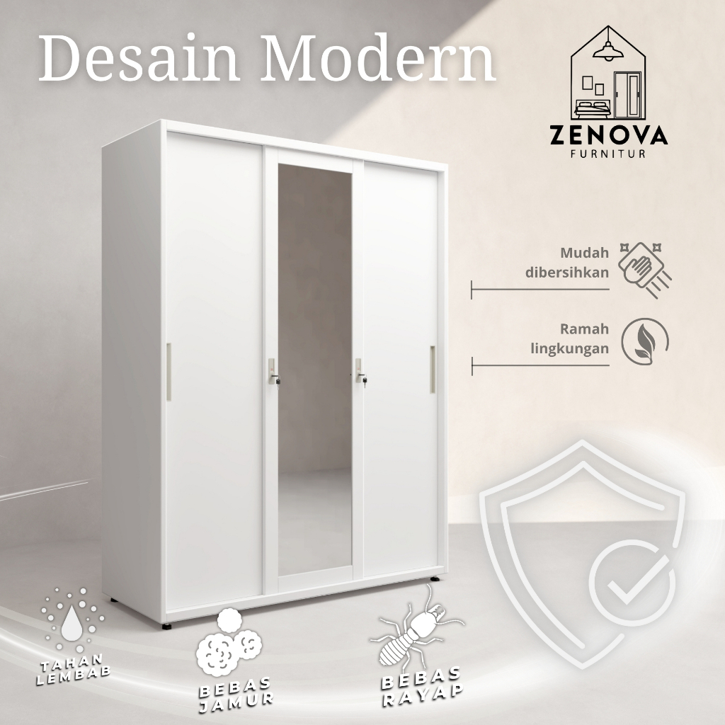 ZENOVA Official Lemari Pakaian Besi Lemari Pakaian 150cm 3 pintu slidding 2 Hanger Cermin Minimalis