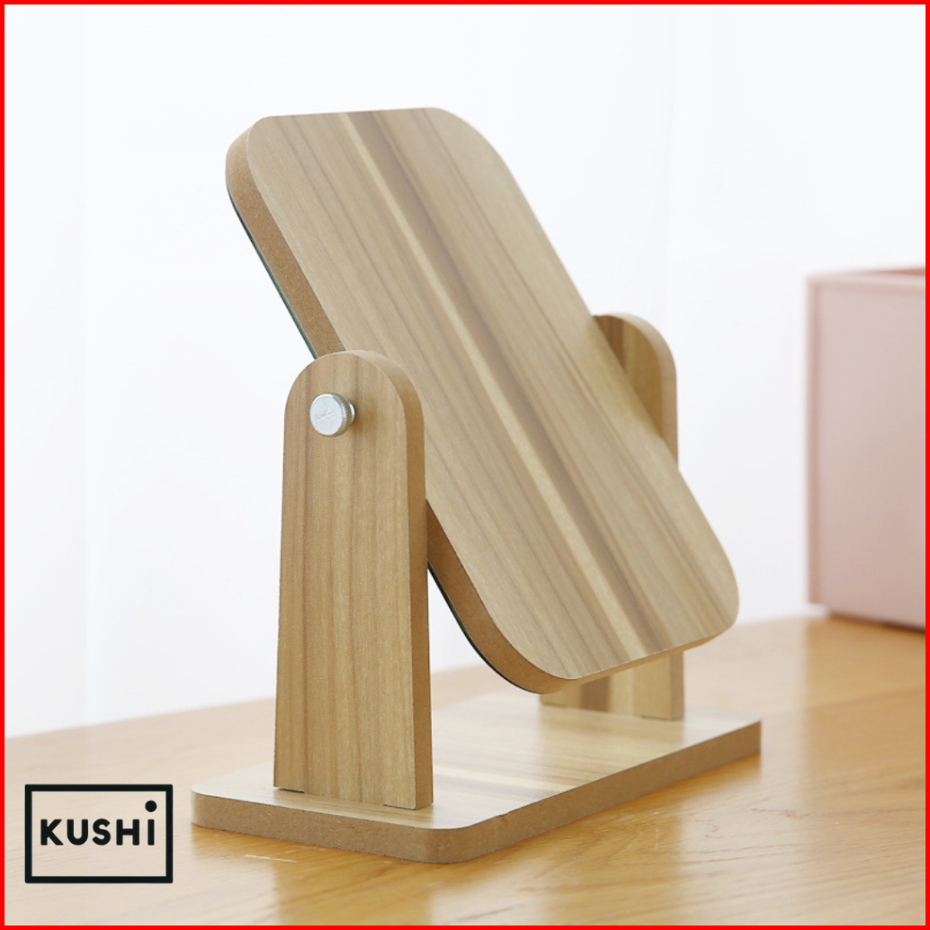 Kushi Cermin Kaca Meja Persegi Minimalis Kayu Portable Putar Premium