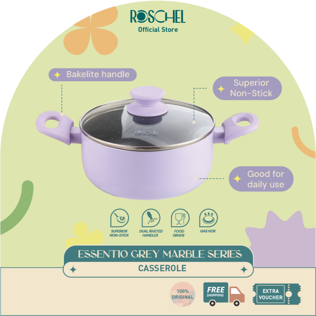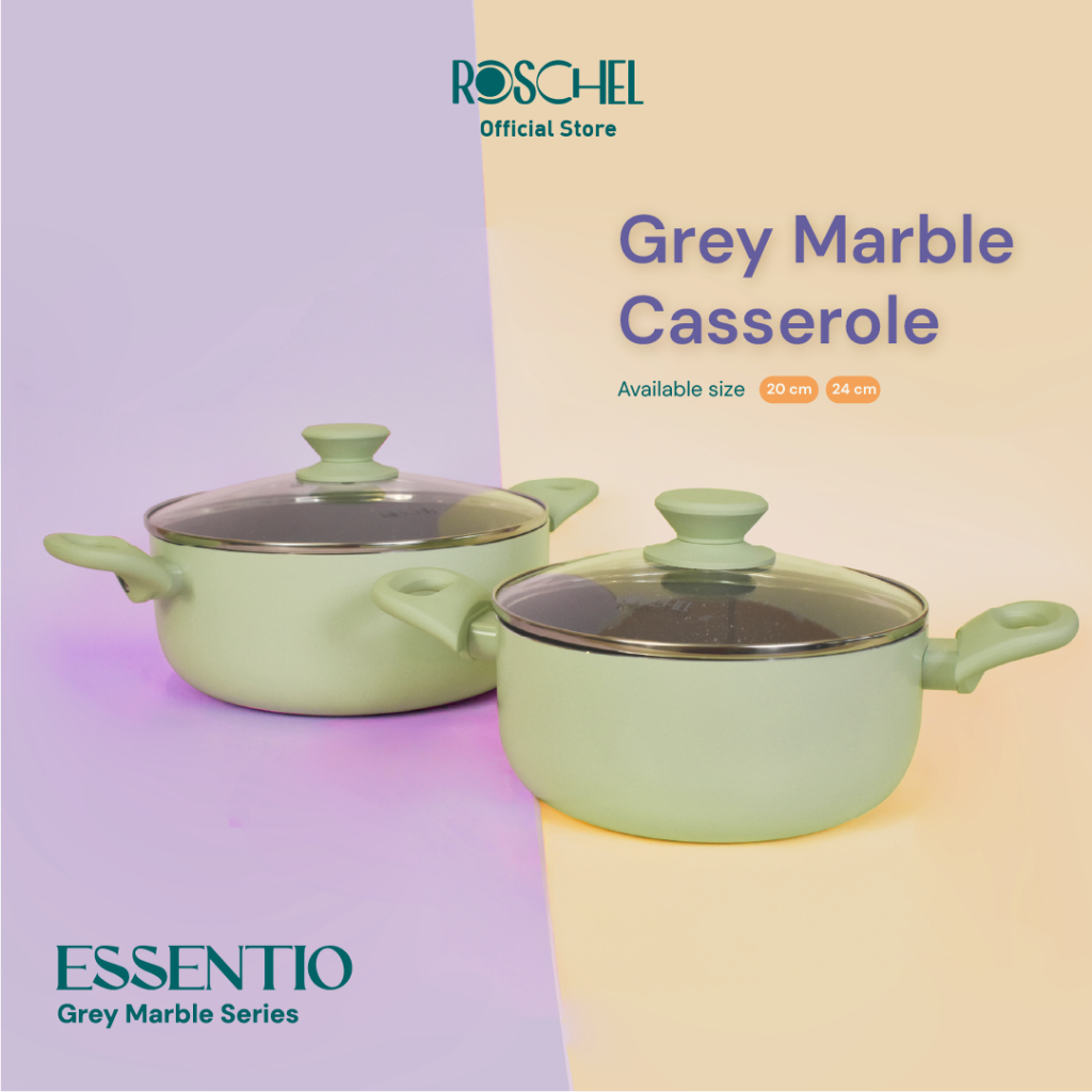 Roschel Essentio Marble Coating Non-Stick Casserole 20 , 24 cm + Tutup Kaca Panci Wajan Penggorengan Dutch Oven Anti Lengket Hijau Ungu