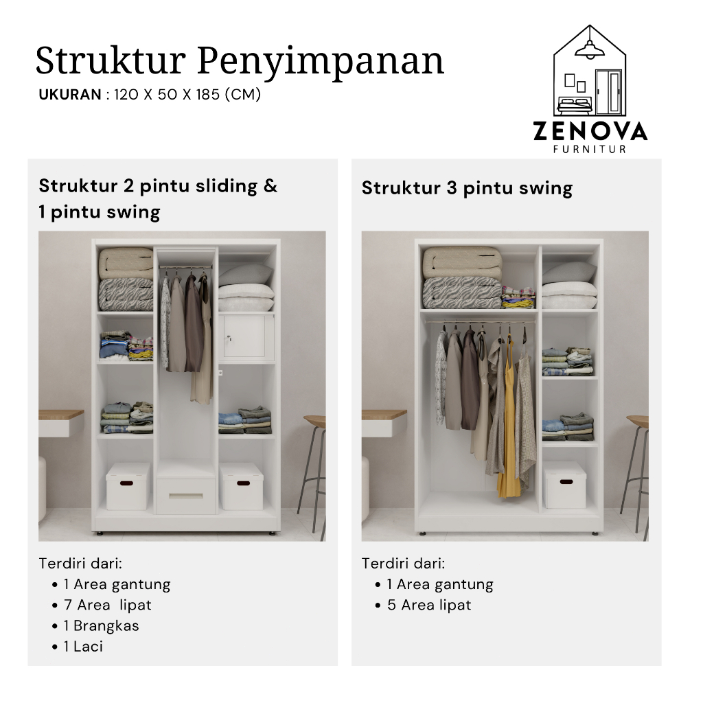 ZENOVA Official Lemari Pakaian Besi 120cm 3 pintu slidding 1 Hanger 1 Laci Cermin Minimalis