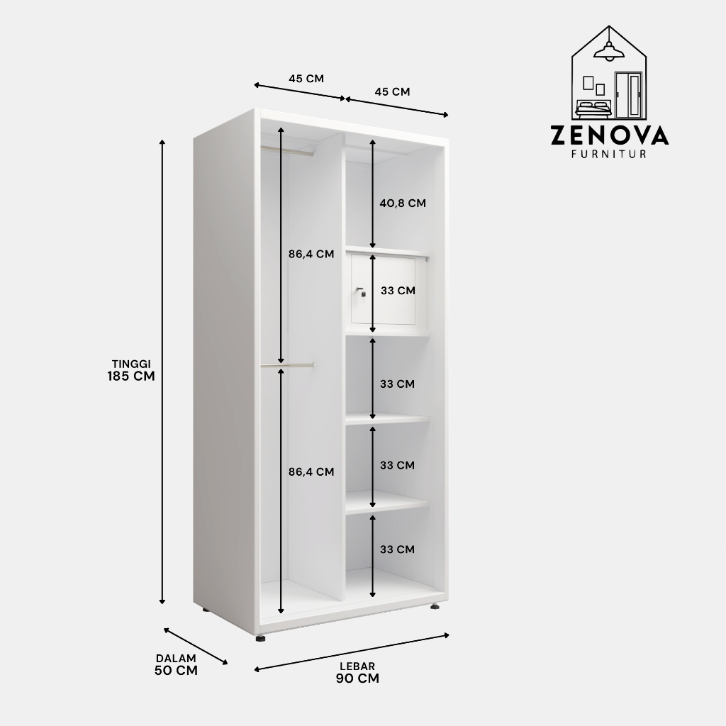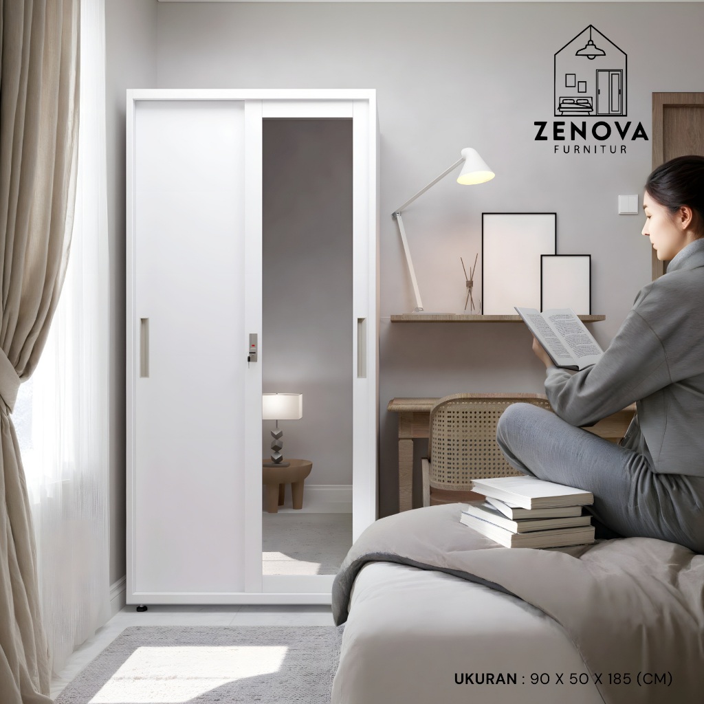 ZENOVA Official Lemari Pakaian Besi Lemari Pakaian 90cm 2 pintu slidding 2 Hanger Cermin Minimalis