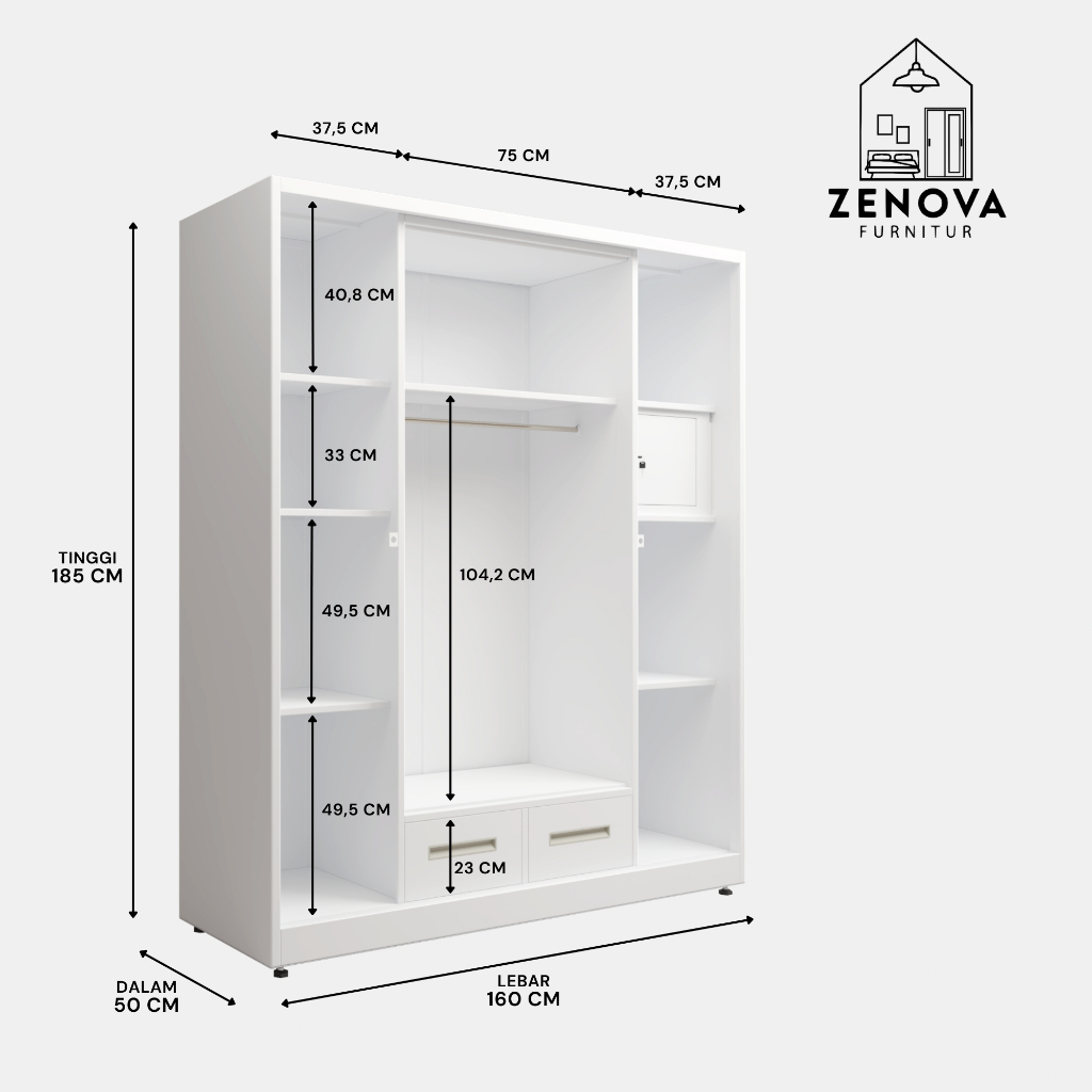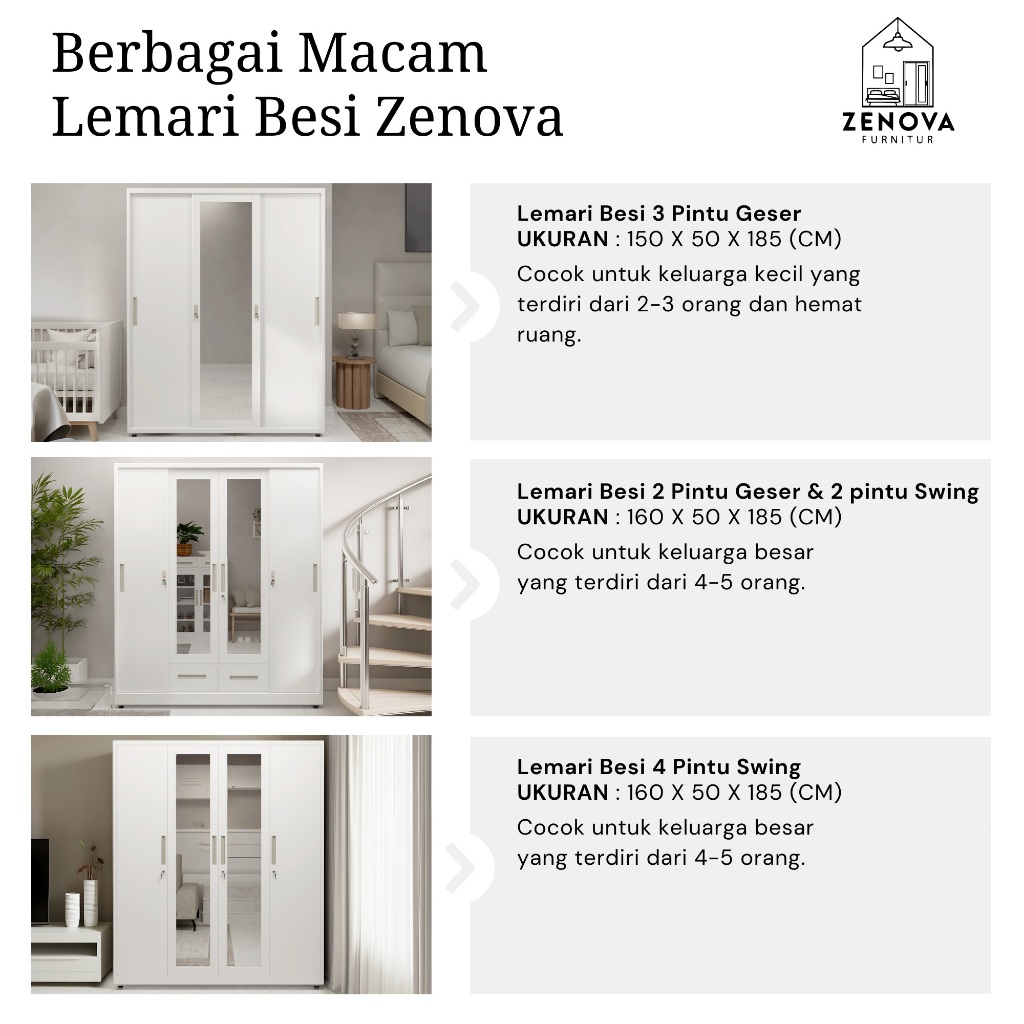 ZENOVA Official Lemari Pakaian Besi 160 Cm 4 Pintu Sliding 1 Hanger 2 Laci Cermin Minimalis