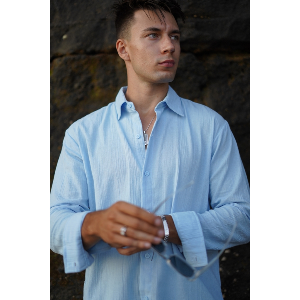 BEACHWELL Kemeja Pria Polos Lengan Panjang Casual Linen Katun Krinkel Premium Putih Hitam Cream Biru Hijau Coklat - Keme