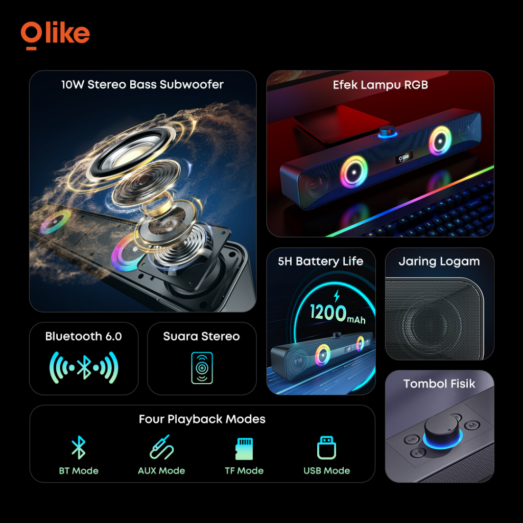 [BEST PRODUCT] OLIKE Speaker Soundbar S5H + RGB 1200mAh, Surround Sound 10W Subwoofer, Stereo Bass Max | Waktu Pemutaran