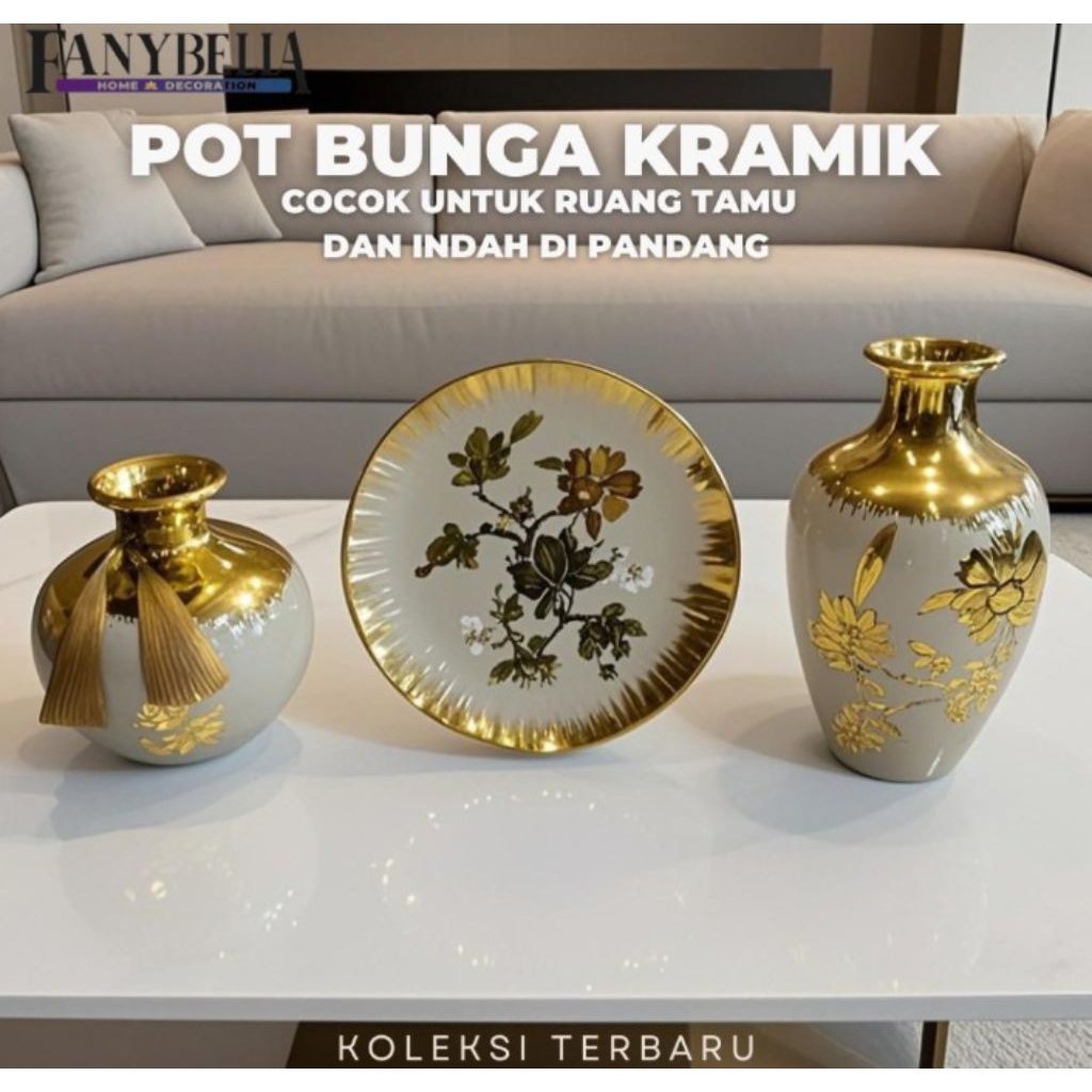 Pajangan Set 3 Vas Bunga Keramik Gold Biru Dekorasi Rumah Import