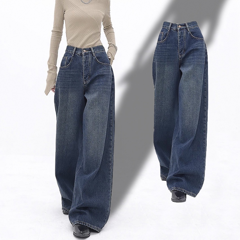 Keygirl Highwaist Baggy Jeans Celana Straight Panjang Retro Biru Pinggang Karet Celana Jeans Panjang