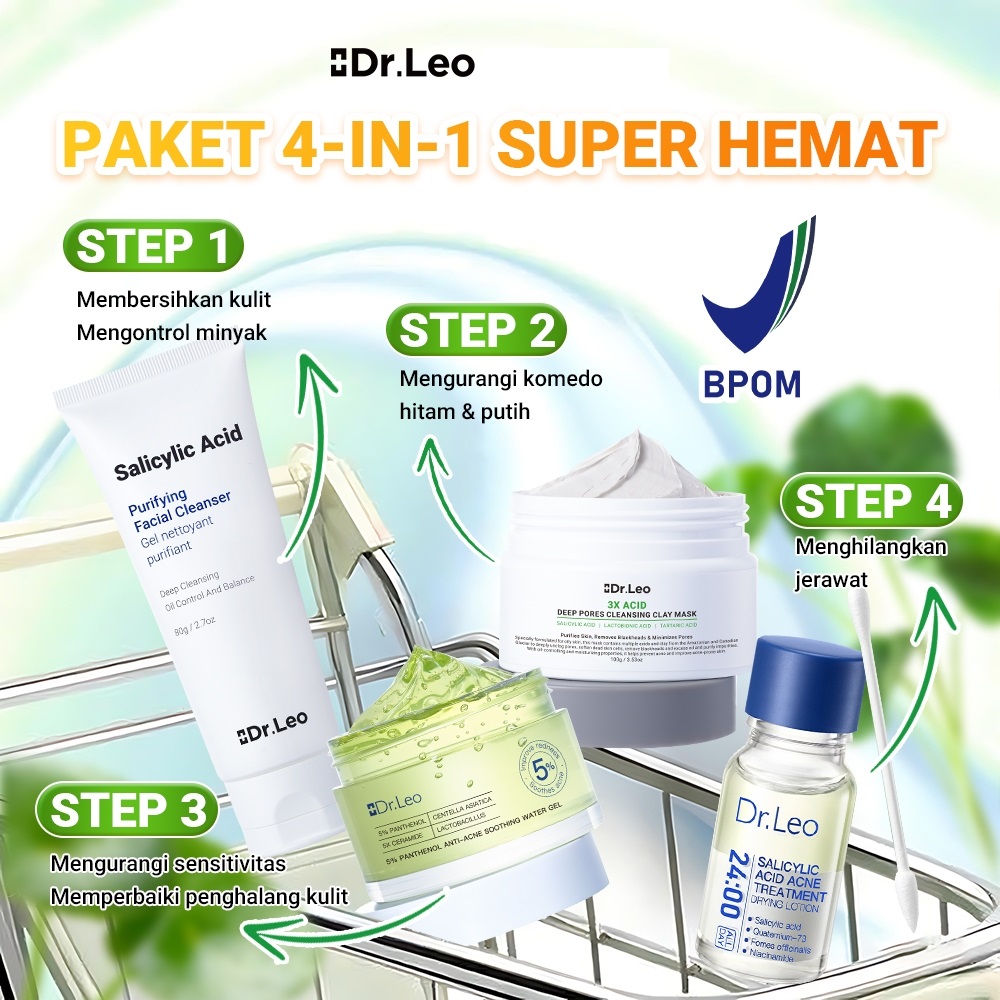 SKINCARE DRLEO 4PCS ACNE SET PAKET ANTI JERAWAT 1.8% SALICYLIC ACID & NICOTINAMIDE ATASI PERADANGAN JERAWAT DENGAN CEPAT