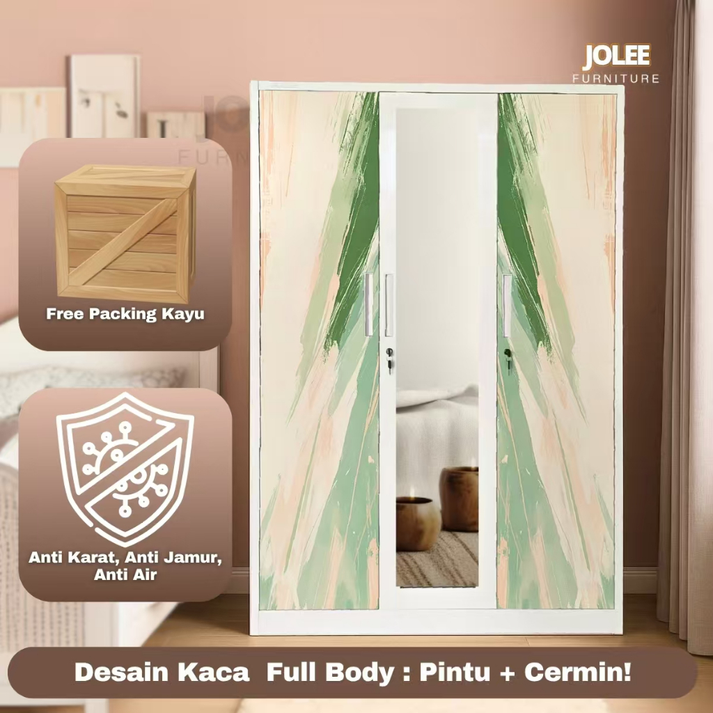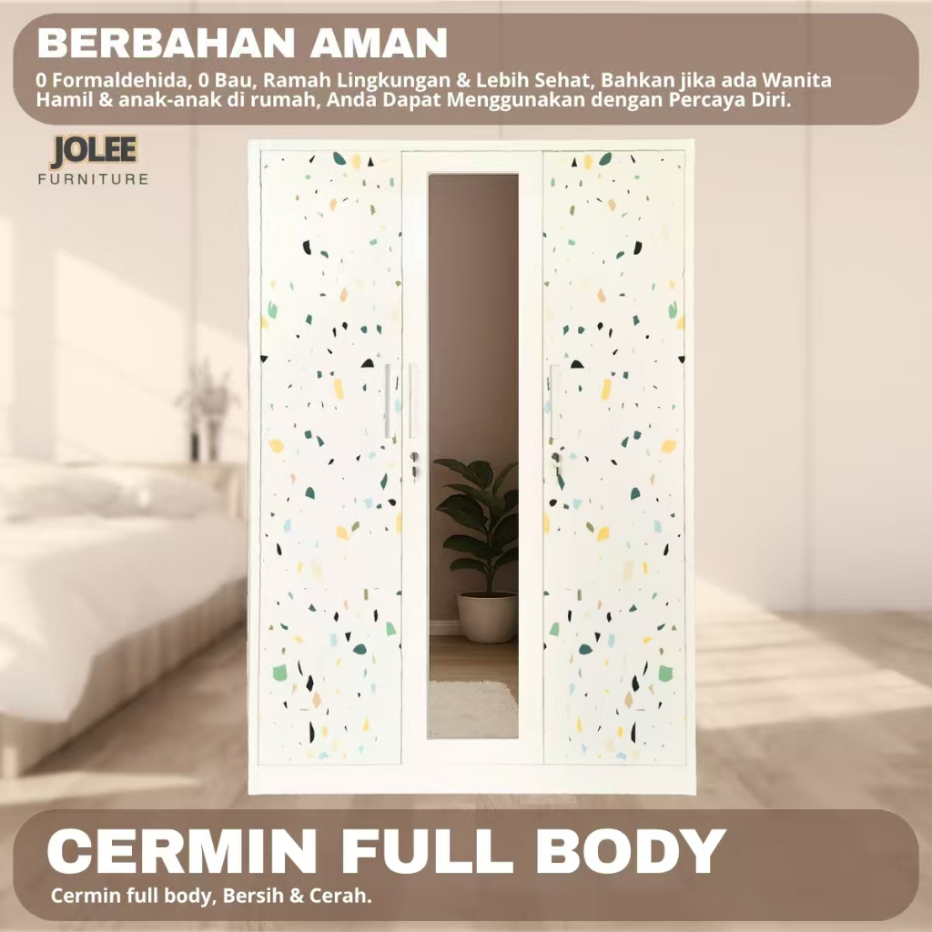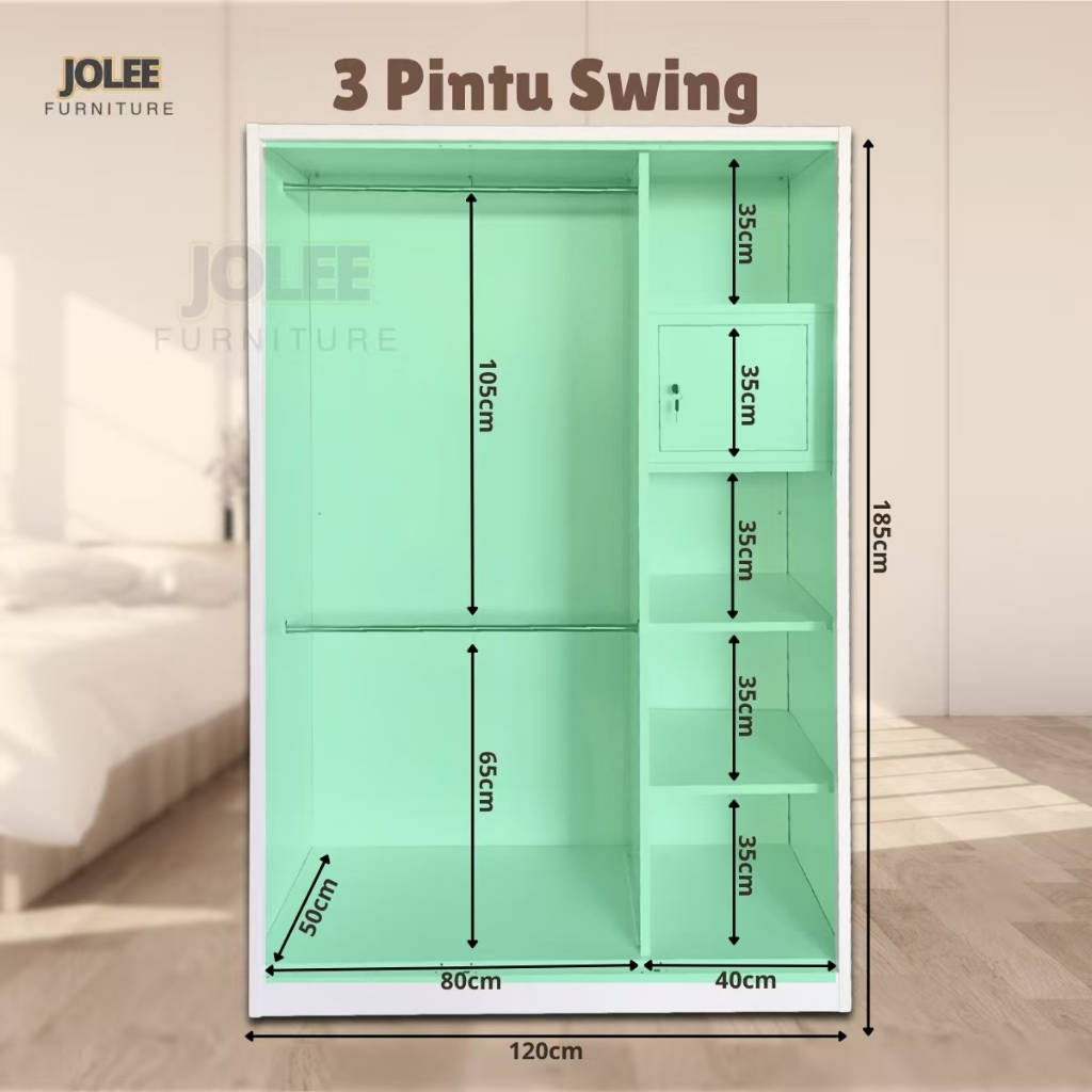 JOLEE-Lemari Pakaian Besi 3 Pintu Jumbo - 150cm 2 Laci 2 Batang Rak Baju