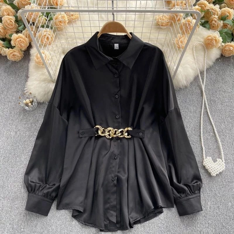 Safaraz Kemeja Wanita Polos Motif Rantai Lengan Balon Korean Style Melda Oversize Jumbo M L Xl Xxl