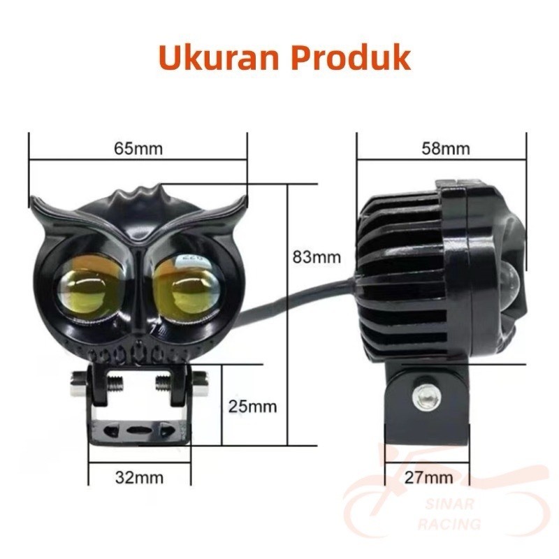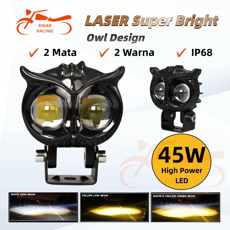 LED Sorot Motor Mobil Owl 2 Mata 45W IP68 Laser Sinar Ring 5000K-6500K Tahan Air Debu 100rb Jam