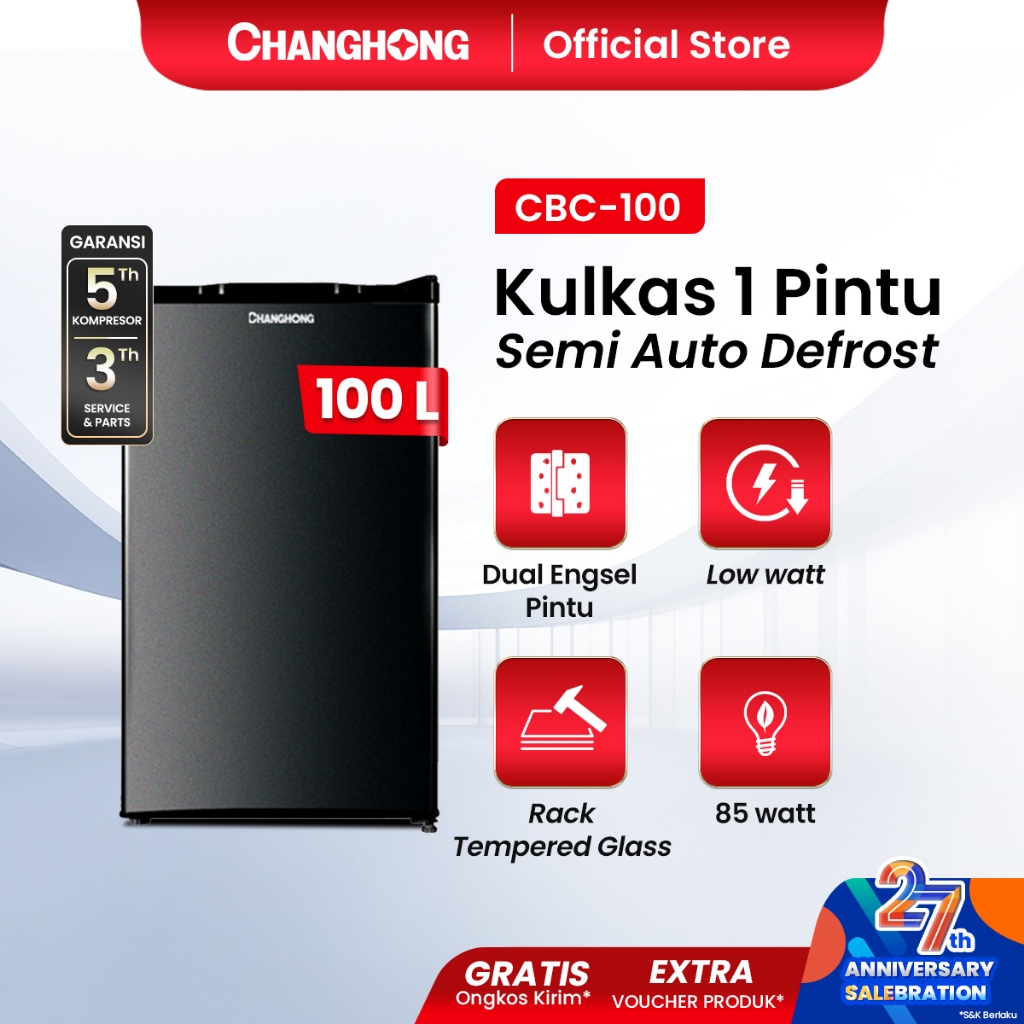 [Mall] Changhong Kulkas 1 pintu (Refrigerator) Lemari Es Kapasitas 100 Liter – Black CBC 100 (Semi Auto-Defrost )