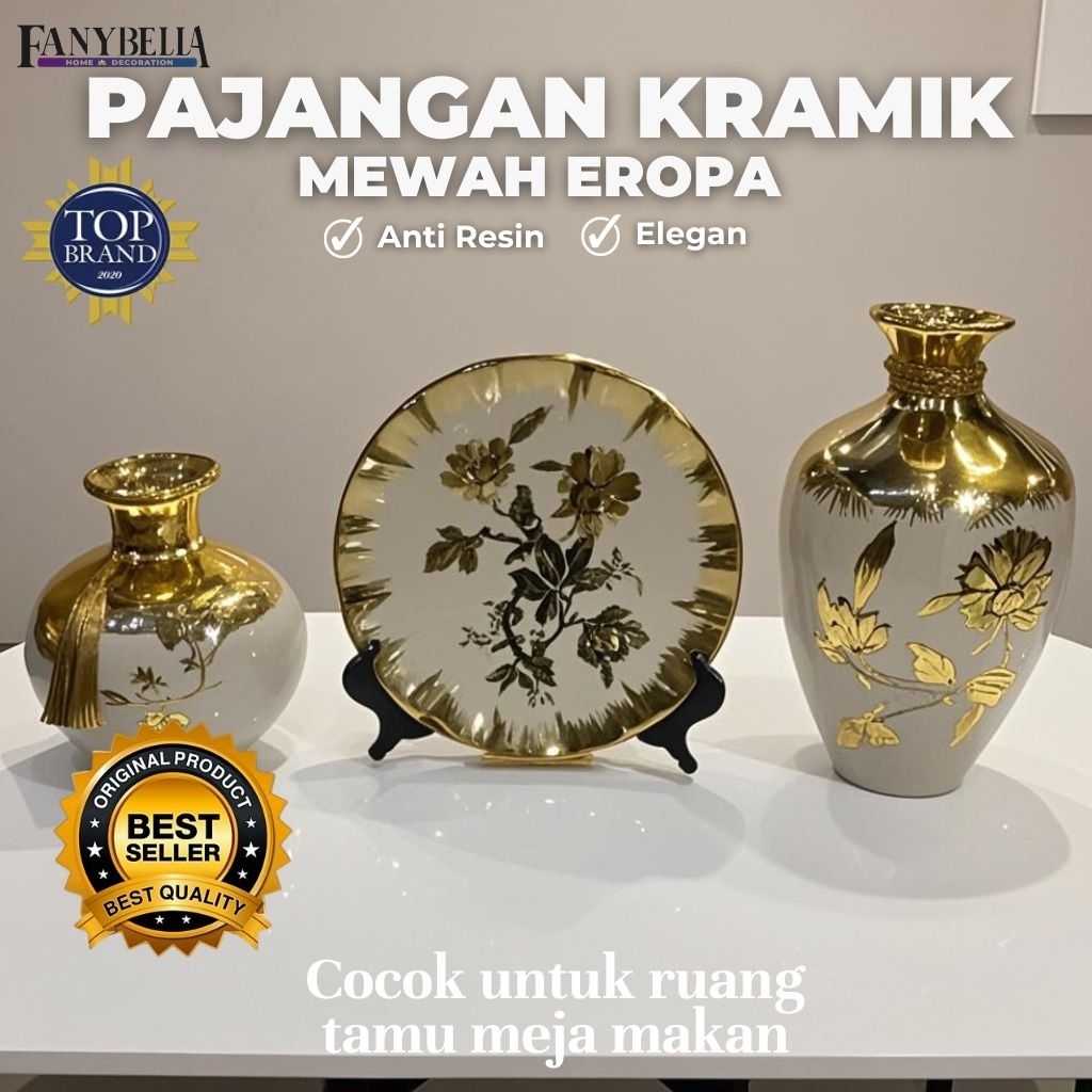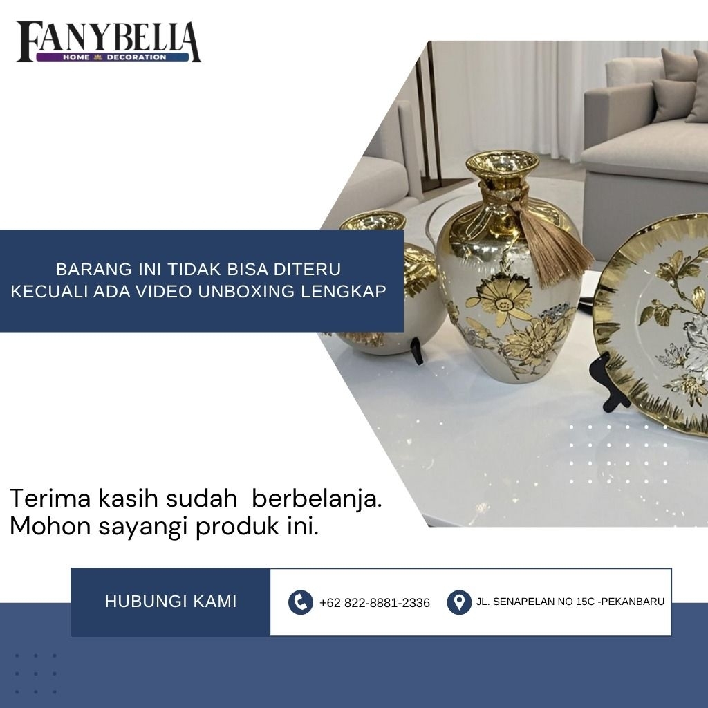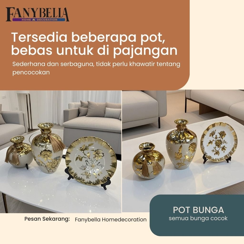Pajangan Set 3 Vas Bunga Keramik Gold Biru Dekorasi Rumah Import