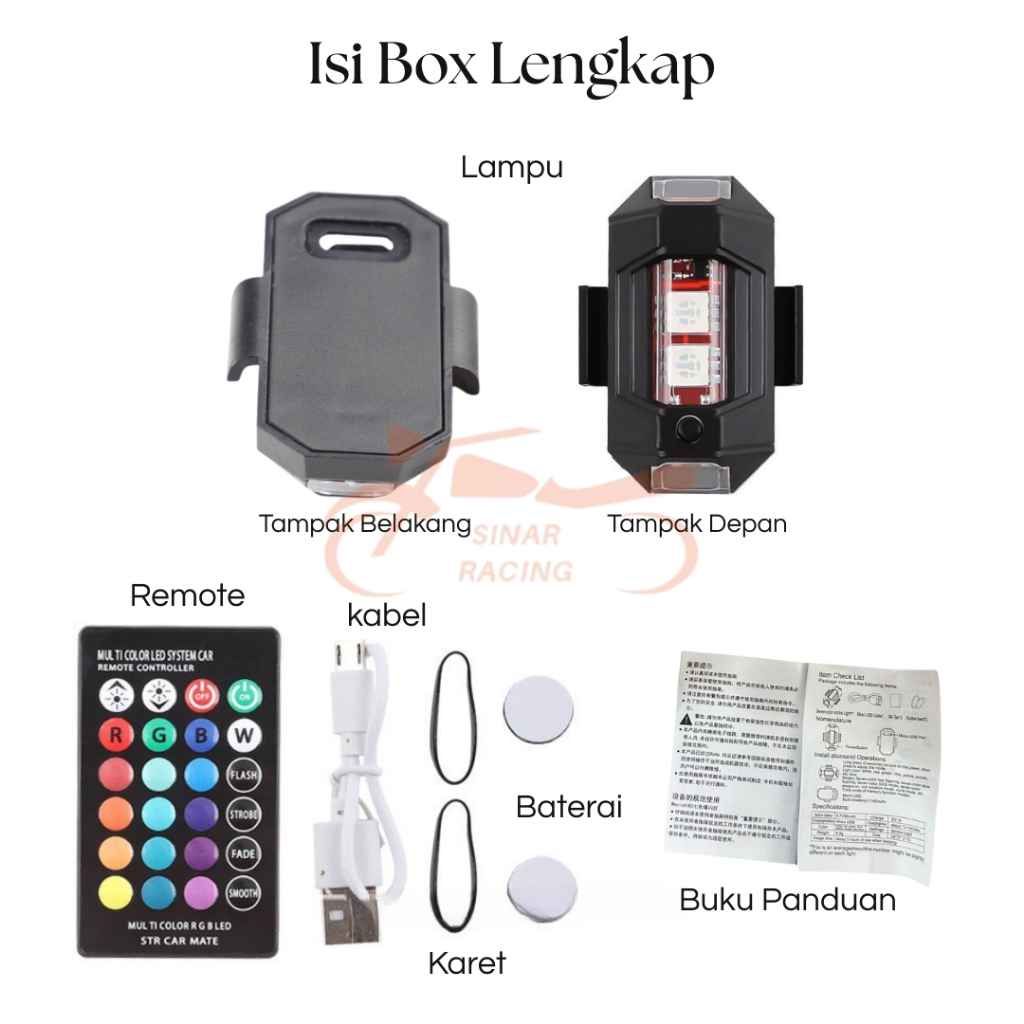 Sinar Rng Lampu LED Pesawat RGB 7 Warna Kedip — Paket 2 Lampu + 1 Remote USB, Strobo Universal untuk Motor & Mobil