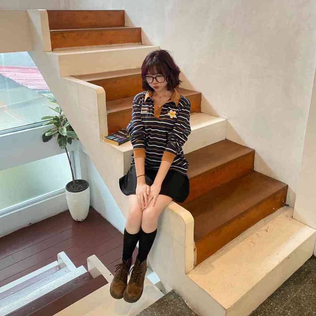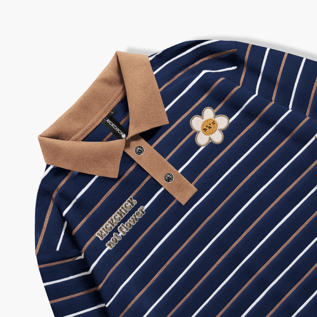Kickchick Longsleeve Polo Stripe Not Flower Embroidery Mocca | Kaos Atasan | Polo Lengan Panjang Stripe | Kc-Ls-Ps-Strip
