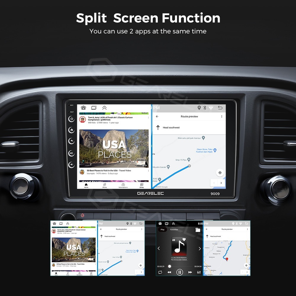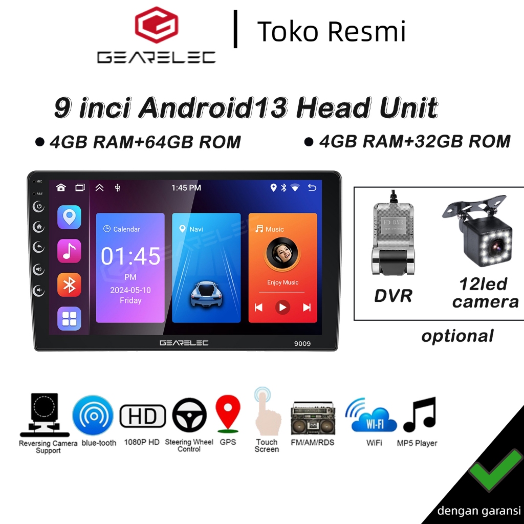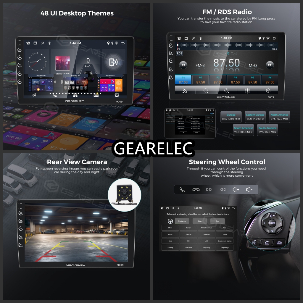 GEARELEC Double Din Universal Android13 Head Unit 9inci 4+64G Support GPS/Youtube/WIFI/48 Tema