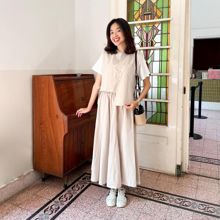 Yeppuoutfit - Sunbin One Set | Basic Setelan Wanita Linen Bawahan Rok Panjang Dan Atasan Outer Vest Asimetris Tali Sampi