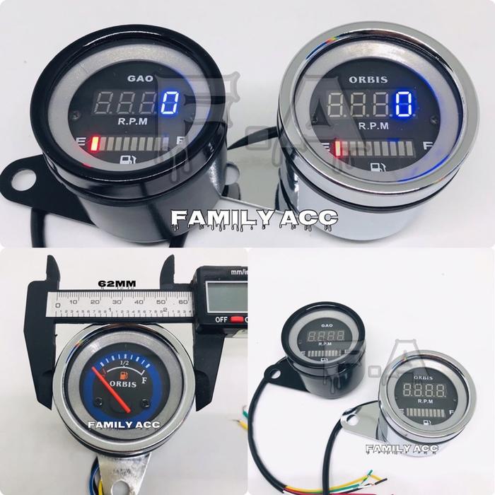 Speedometer Bulat 2in1 Digital Rpm plus Fuel Meter/ Amper Bensin Untuk Semua Jenis Motor Custom - Chrome