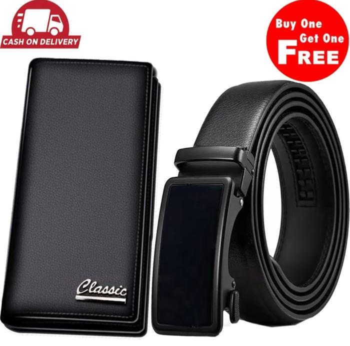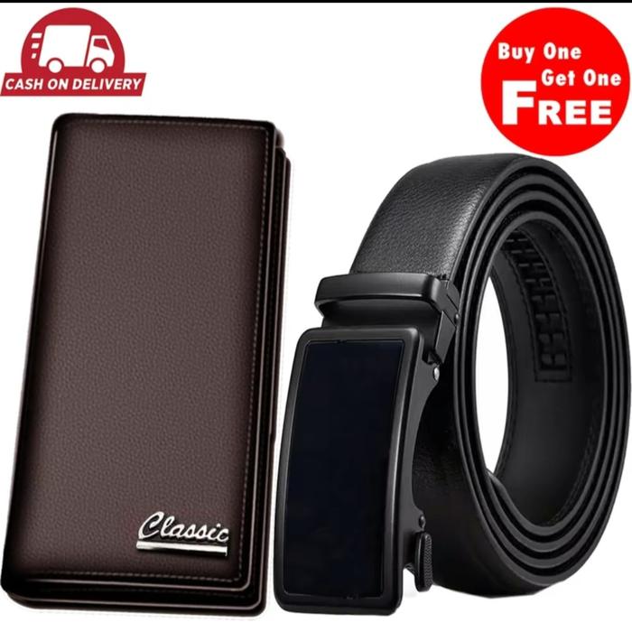 BELI 1 Gratis 1 Dompet panjang kulit D29 ikat pinggang kulit pria rel automatis panjang 120cm Gesper elegan - Hitam