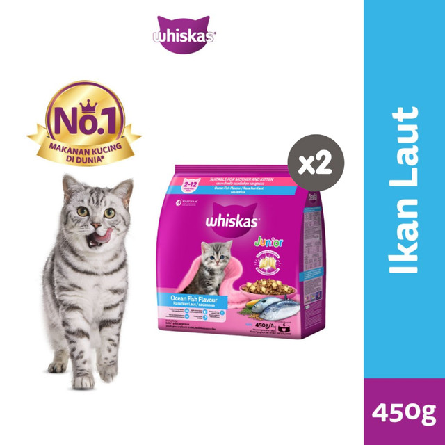 WHISKAS® Makanan Kucing Junior (2-12 Bulan) Kering Rasa Ikan Laut 450gr x 2 pcs