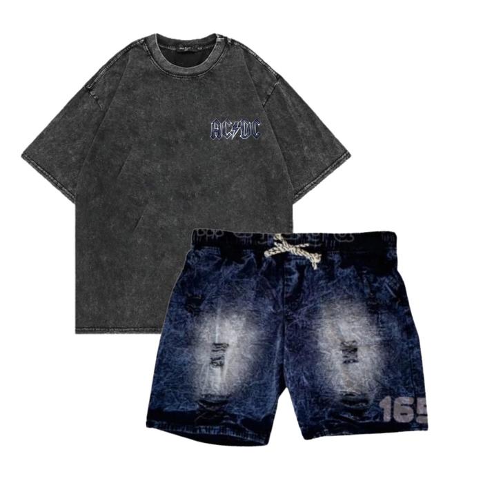 Setelan Pria Kaoa Acdc Dan Celana Jeans Motif Sobek Celana Pendek Pria Dewasa Kaos Washing Oversize Distro - Setelan Acd