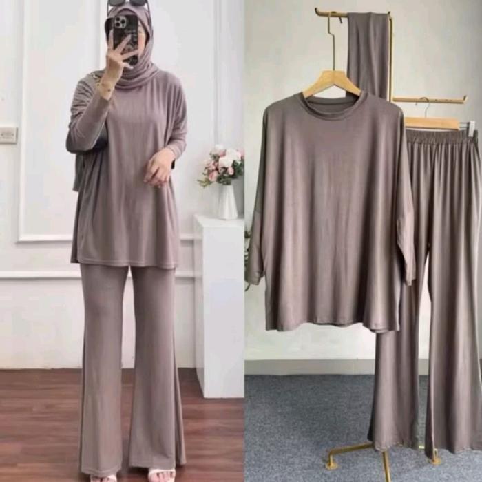 One Set 3In1 One Set Cutbray + Pashmina Setelan Baju Muslim Terbaru Atasan Celana Wanita Dewasa Remaja Kulot Panjang - H