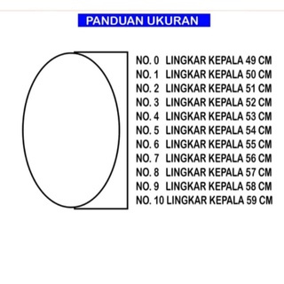 No 1=51 cm 2-3 thn, No 2=52 cm3-4 thn, No 3=53 cm 4-5 th, No 4=54 cm=5-6 thn, No 5=55 cm 6-7 thn, No 6= 56 cm=7-10thn, No 7=57 cm=11-15 thn, No 8=58cm=15thn, No 9=DEWASA