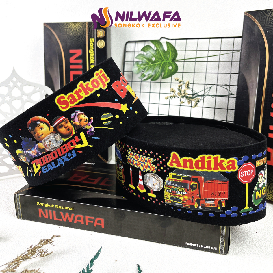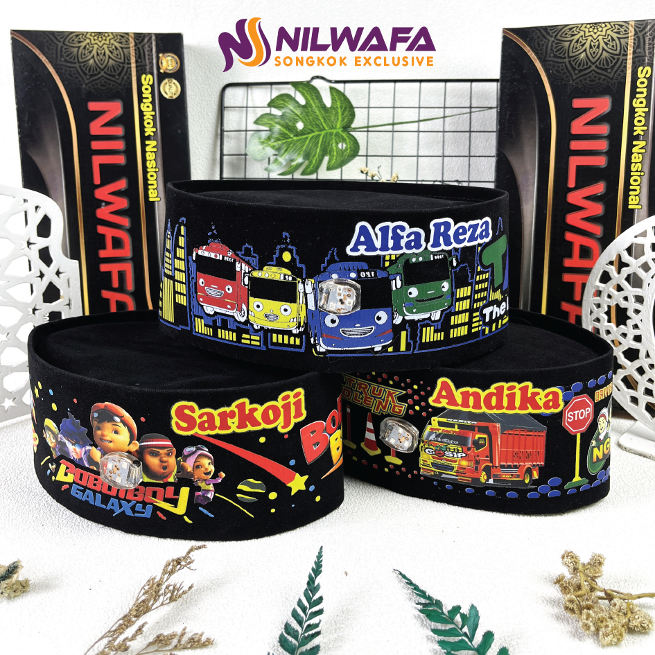 GRATIS NAMA Peci Anak Songkok Kopyah LED GRATIS NAMA ANAK Motif Karakter masjid Spiderman Upin Ipin Tayo Tobot Truk Olen