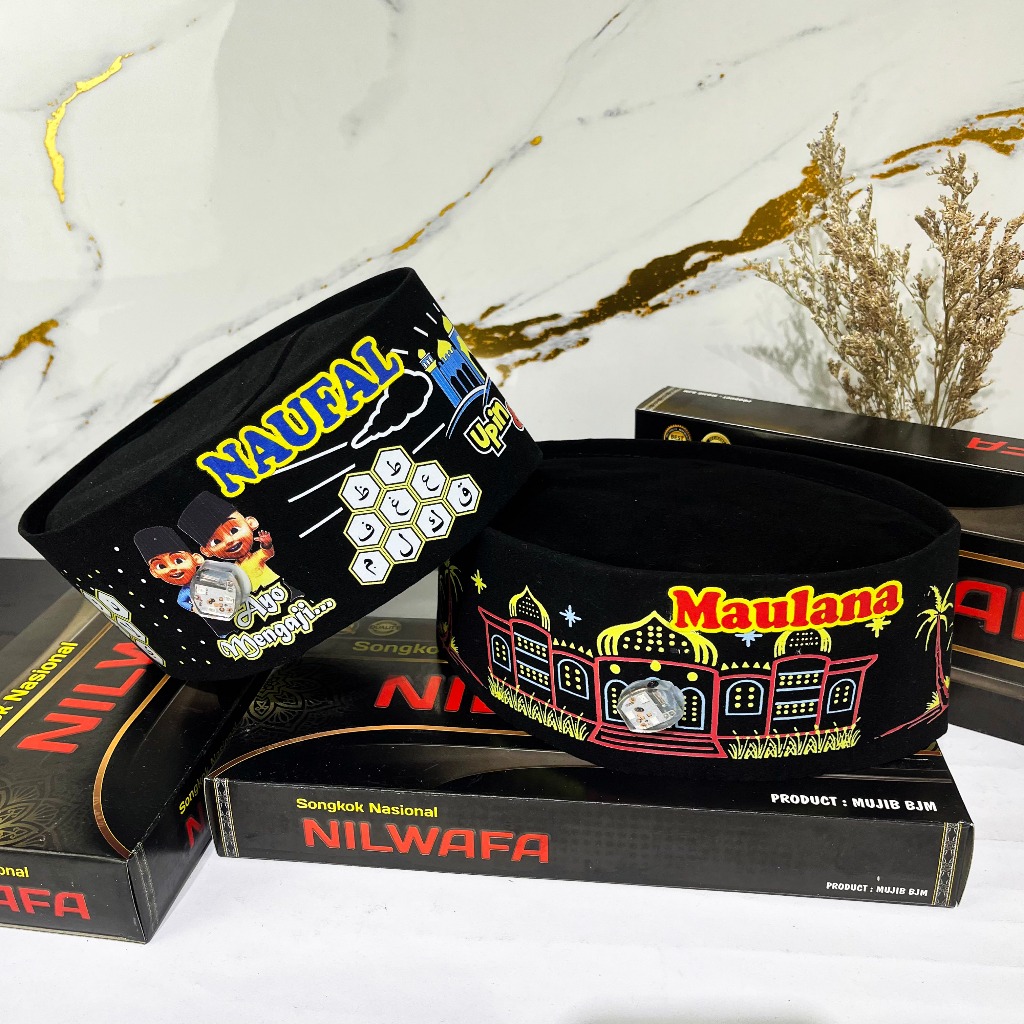Peci/Songkok/Kopyah LED GRATIS NAMA ANAK Motif Karakter masjid Spiderman Upin Ipin Tayo Tobot Truk Oleng Mobile Legend