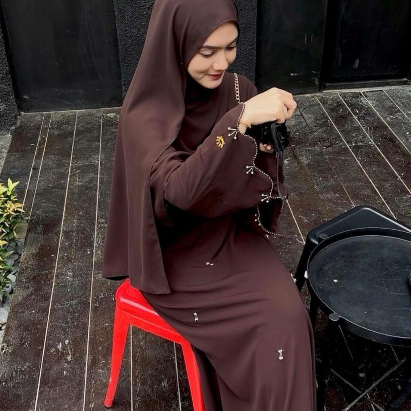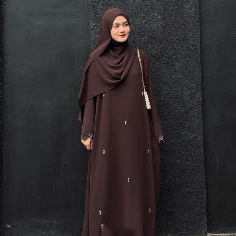 Yasmen abaya dress bahan marbela anti uv aplikasi et mutiara abaya umroh anti uv simple mewah elegant