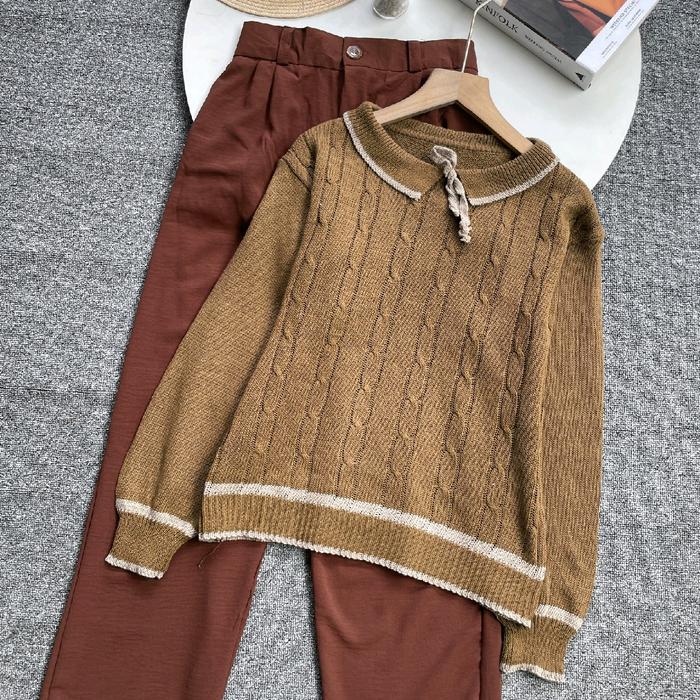 Vienetta.Id - Oneset Setelan Wanita Cable Rajut Korean Style Mix Kulot Outfit Wanita Cewek Remaja Baju Atasan Pita Coque