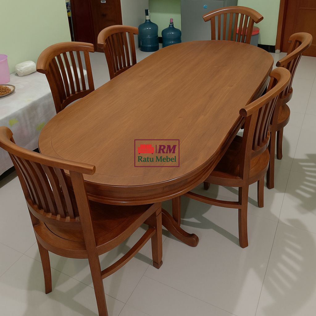 Meja Makan Kayu Jati Oval 6 Kursi + Kaca Tebal Elegan – Finishing Natural Mewah