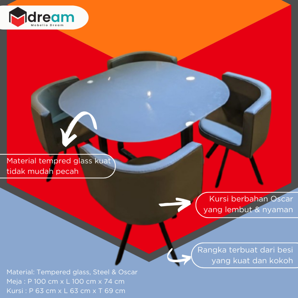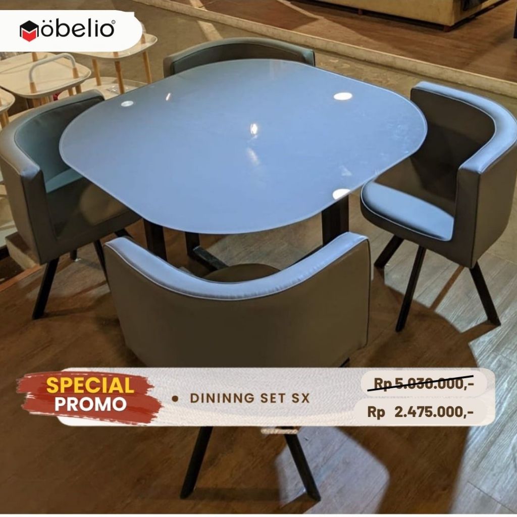 Mobelio - Meja Makan Dining Set Kaca Minimalis Box 4 Seater Kursi Bangku Abu abu Grey - SX