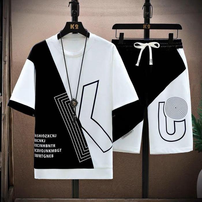 Setelan Hk Lengan Pendek Celana Pendek Pria Kaos Panjang Katun Setelan Dewasa Dan Anak - Putih Hitam, Anak 12-15 Tahun