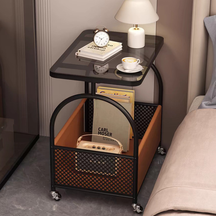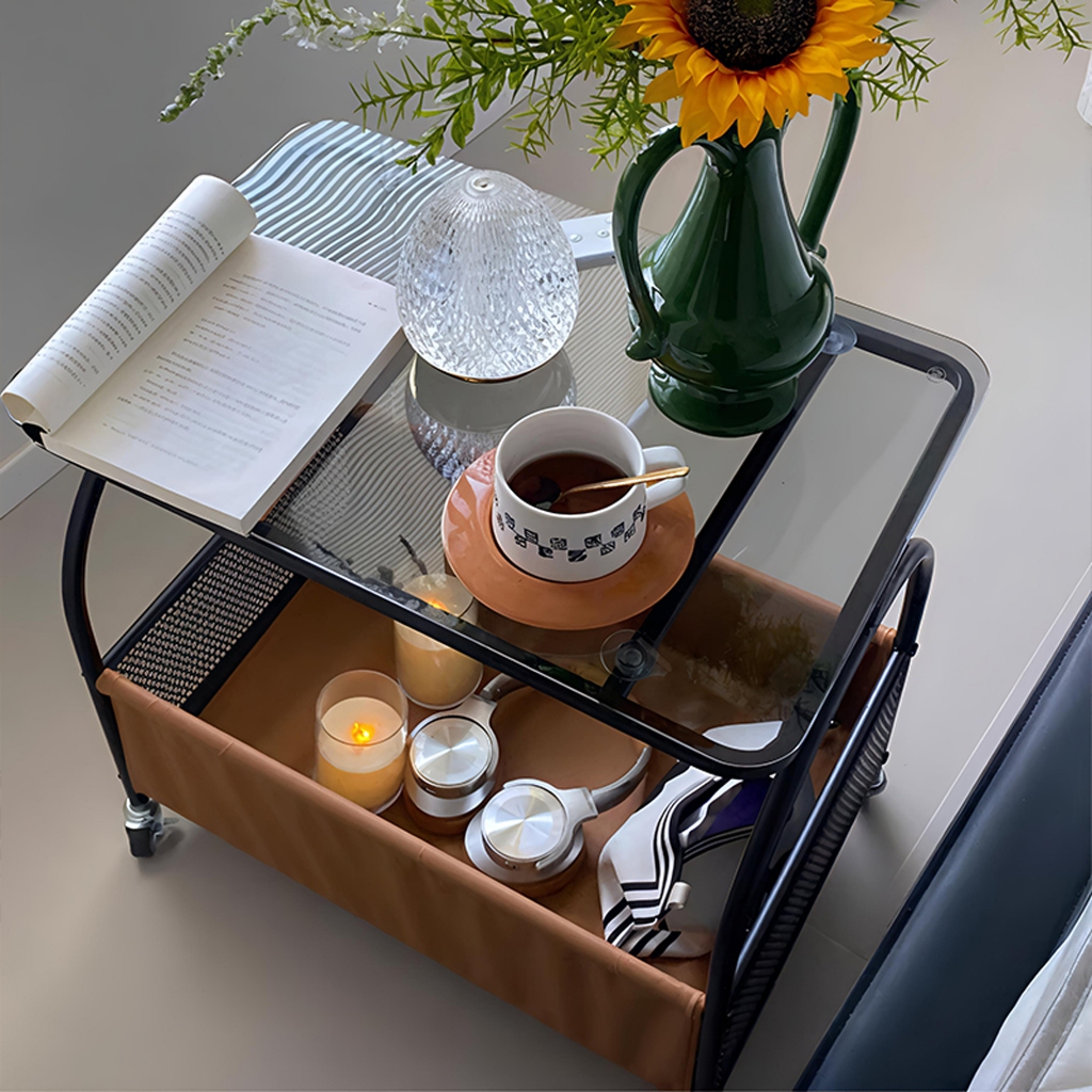 Meja Kopi Seluler Besi+Kaca Meja Tamu Rak Penyimpanan Dua Lapis Santai Meja Kopi Meja Meja Kecil Kamar Meja Samping Sofa Dengan Roda Meja