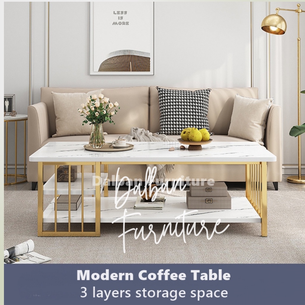 Meja Ruang Tamu Minimalis 3 Layer Meja Tamu Susun Rangka Besi Motif Marmer