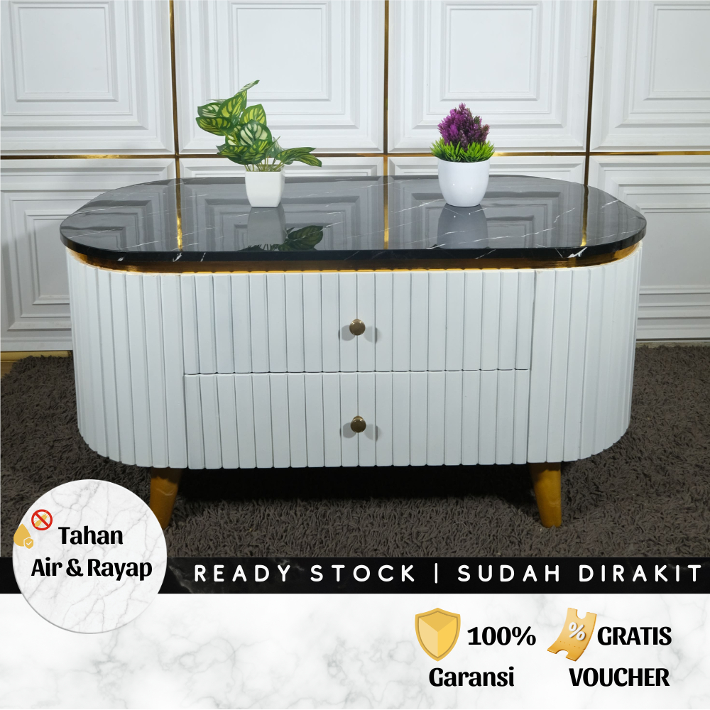 Meja Kopi Minimalis Modern 100cm - Meja Tamu Oval 2 Rak HPL Marmer Hitam Gold Ruang Tamu