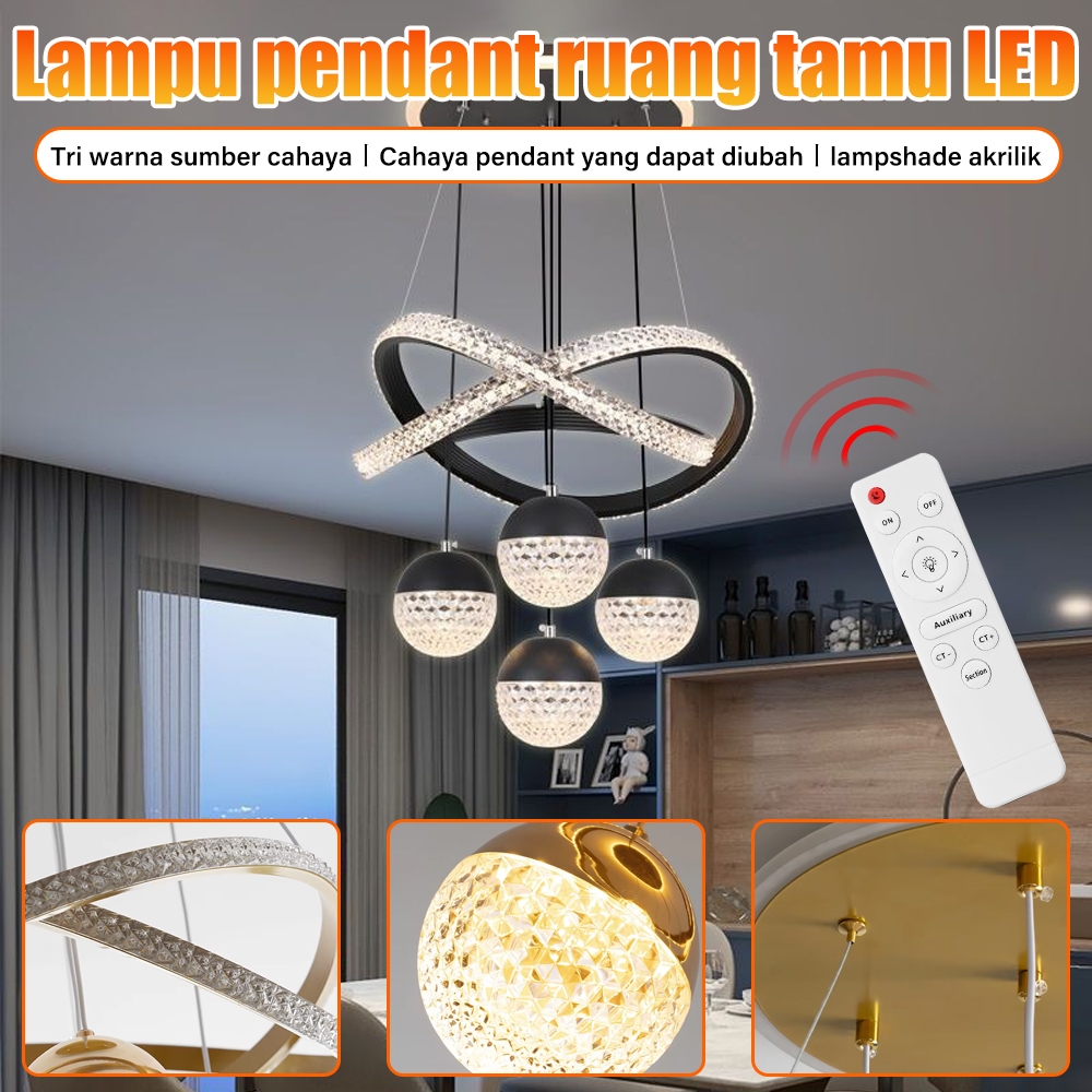 Lampu Gantung Dekoratif Minimalis Kristal LED 3 Warna - Mewah untuk Ruang Tamu, Ruang Makan, dan Restoran