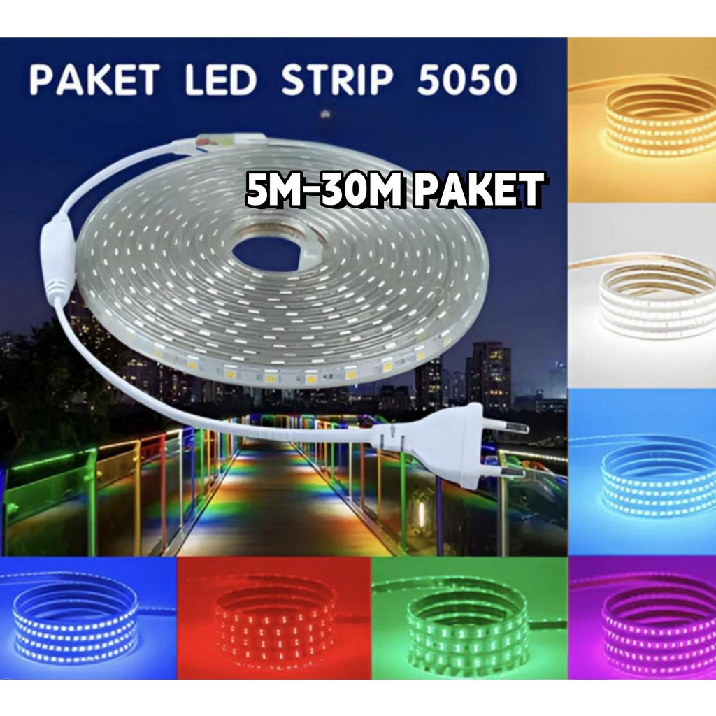 PAKET Lampu Led Strip Selang 5050 5m 8m 10 meter 10m 20m 25m 30 meter(lampu strip+ Socket+tutup )5050 Lampu Hias Cafe Led Strip