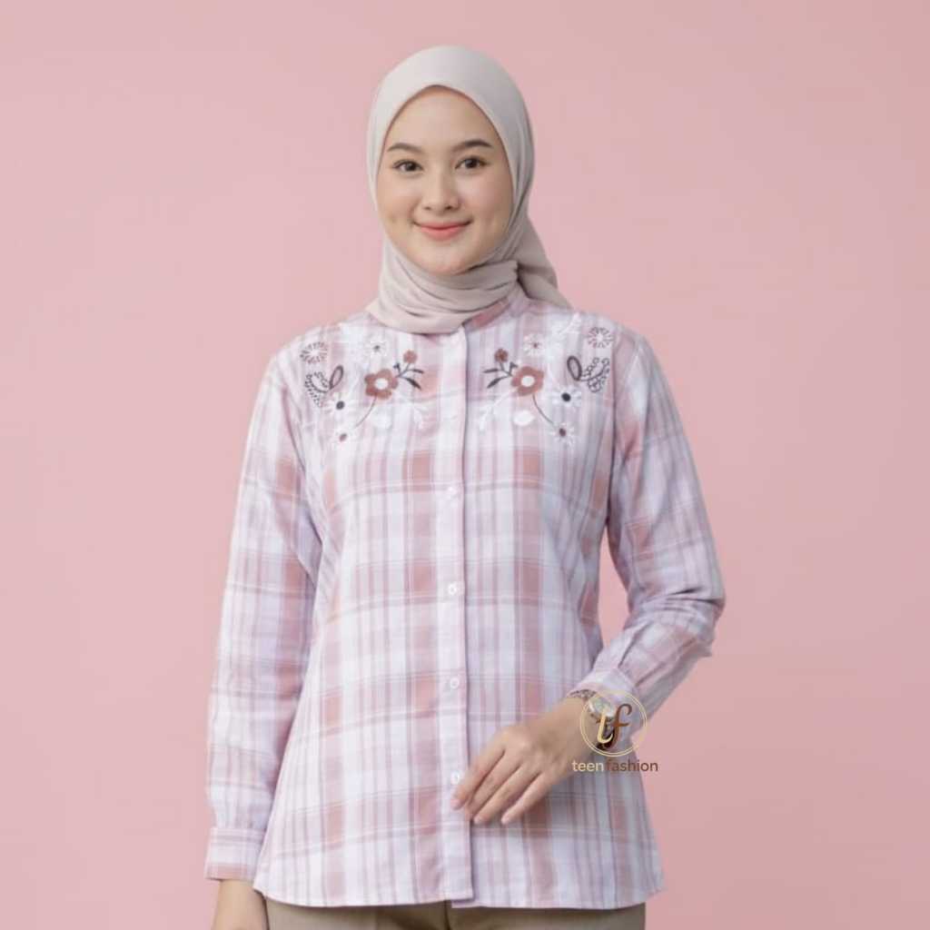 Kemeja Atasan Wanita Kotak-kotak Motif Bordir Bahan Katun Haruka Premium